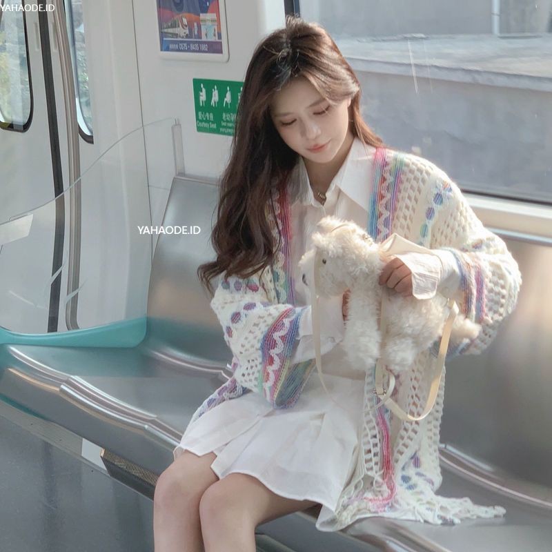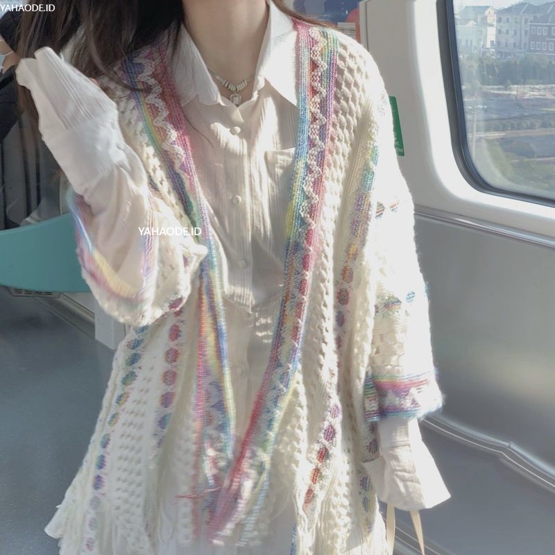 YAHAO JAKET WANITA KARDIGAN RAJUTAN BERONGGA LONGGAR SELENDANG ETNIK RETRO UNTUK BEPERGIAN CARDIGAN RAJUT RAINBOW