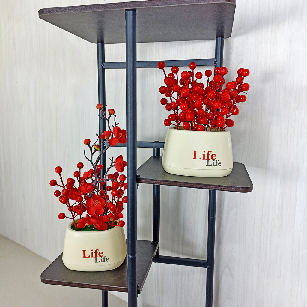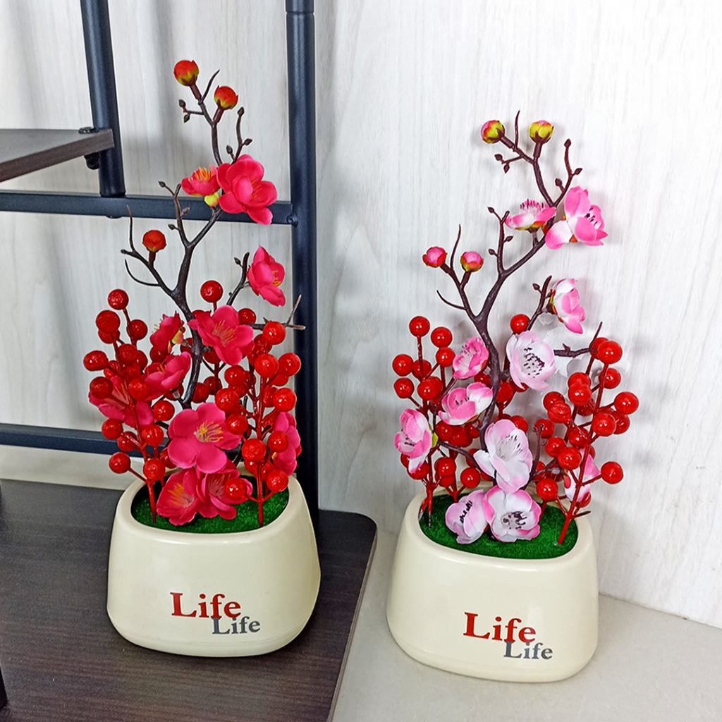 Pot Tanaman Bunga Hias Plastik Sakura Red Blossom Artificial Flower Ornamen Dekorasi Rumah PBP167