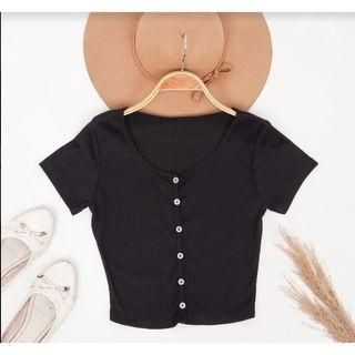 CROP TOP WANITA Basic Round Neck Short Sleeve Button Down Ribbed Crop Top CROP TOP WANITA UP KOREAN STYLE