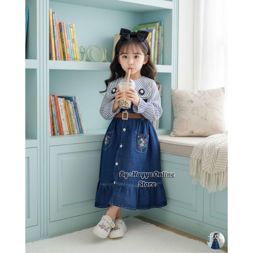 Alesha Gamis Lengan Motif Salur Mix Jeans Anak Perempuan Free Belt Usia 3-10 Tahun Bahan Katun Mix Jeans Premium - Gamis