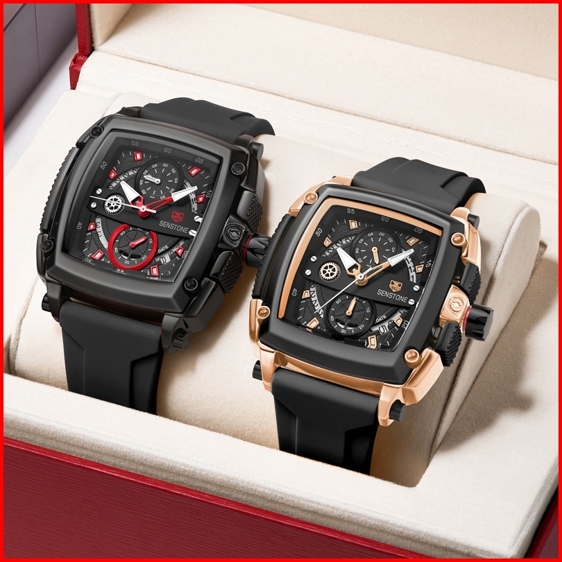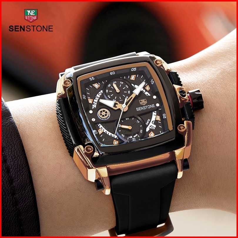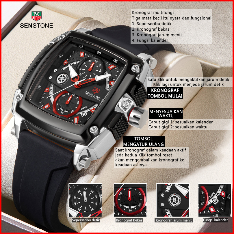 Senstone Jam Tangan Priaterbaru Asli Anti Air Kalender Bercahaya Mewah Hitam Mewah Baja Tahan Karat Jam Pria Kotak Hadia