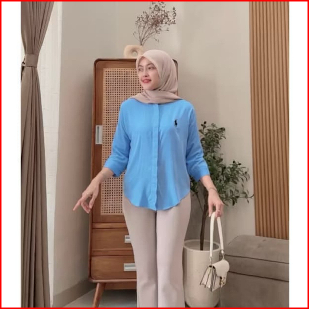 Geneaby - Atasan Kemeja Wanita Bordir Polo Bahan Rayon Twill Size L Xl Xxl Kantor Lengan 7 8