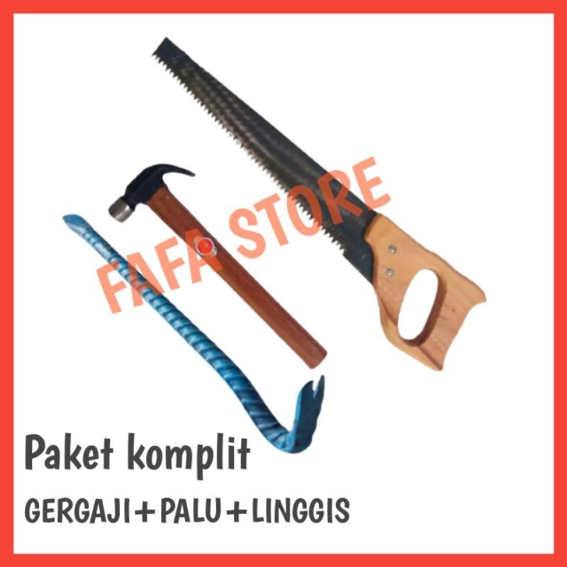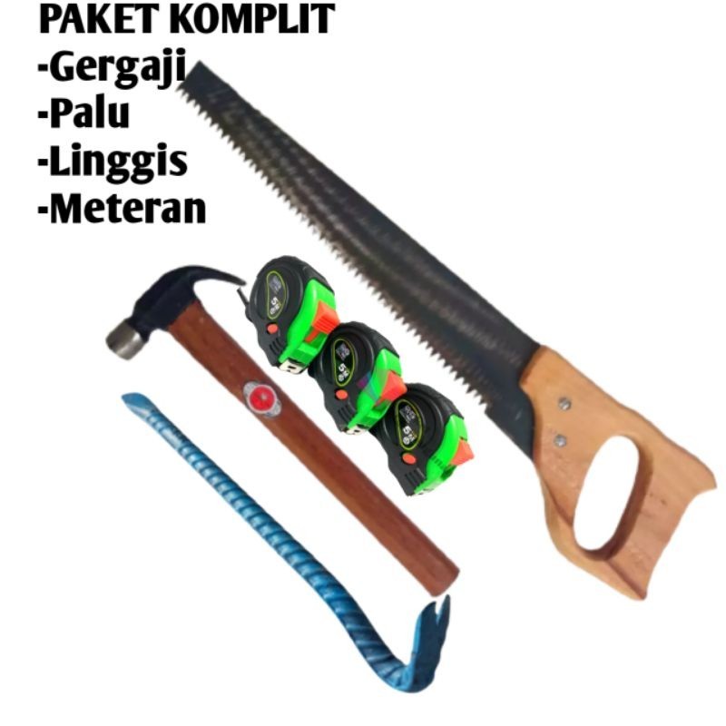 PAKET ALAT TUKANG - Gergaji Kayu Baja Asli Siap Pakai - Palu kambing -Linggis mini - Meteran 3M
