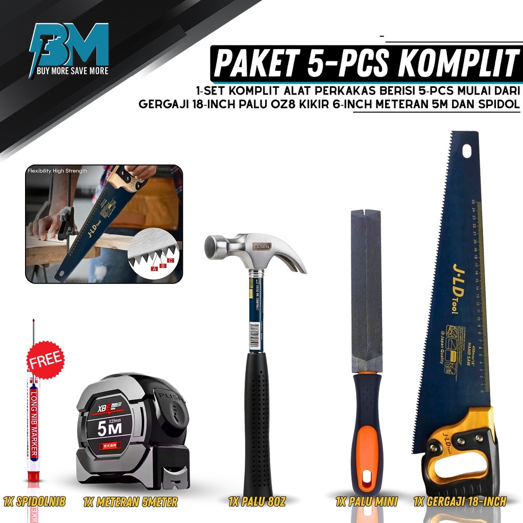Paket Alat Tukang Palu Kambing Fiber Pahat Set Kayu-Sikumeter 10 Inch-Gergaji Kayu 18 Inch Meteran 5M Kikir Gergaji 6inch Termurah Berkualitas