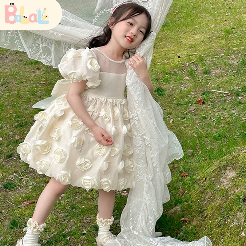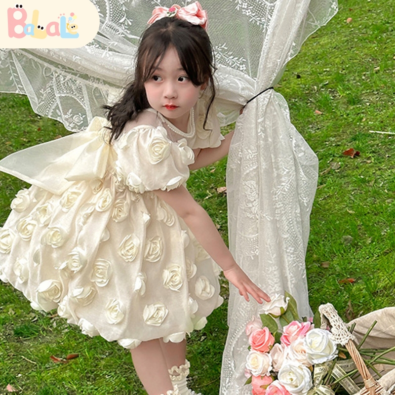 Balale -Baju Pesta Dress Anak Perempuan Usia 1-8 Tahun Gaun Putri Warna Krim Dengan Motif Mawar Princess Dress