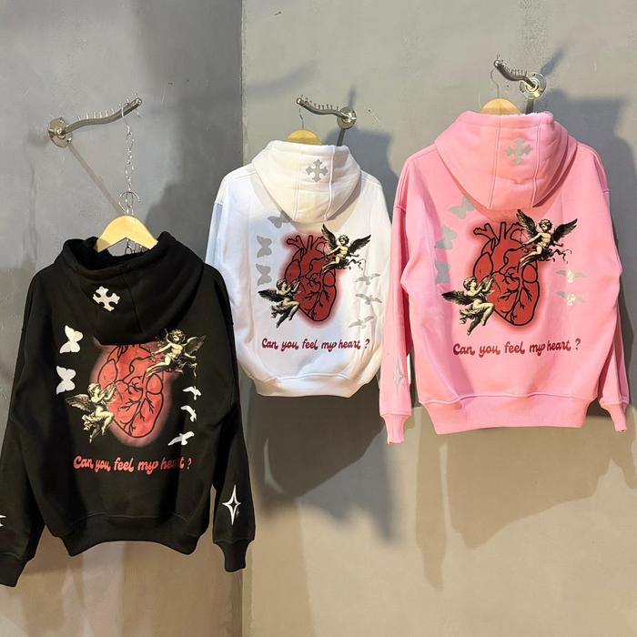 JDMCO - HOODIE BOXY MOTIF JANTUNG KUPLUK SHERPA SABLON DTF + REFLECTIVE FLEECE 280-300 GSM - HOODIE HITAM JANTUNG, M