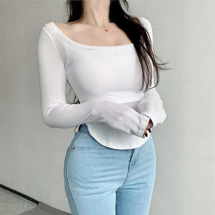 7268 Square Neck Crop Top Slit Long Sleeve : Kaos Crop Slit Lengan Panjang : Atasan Wanita