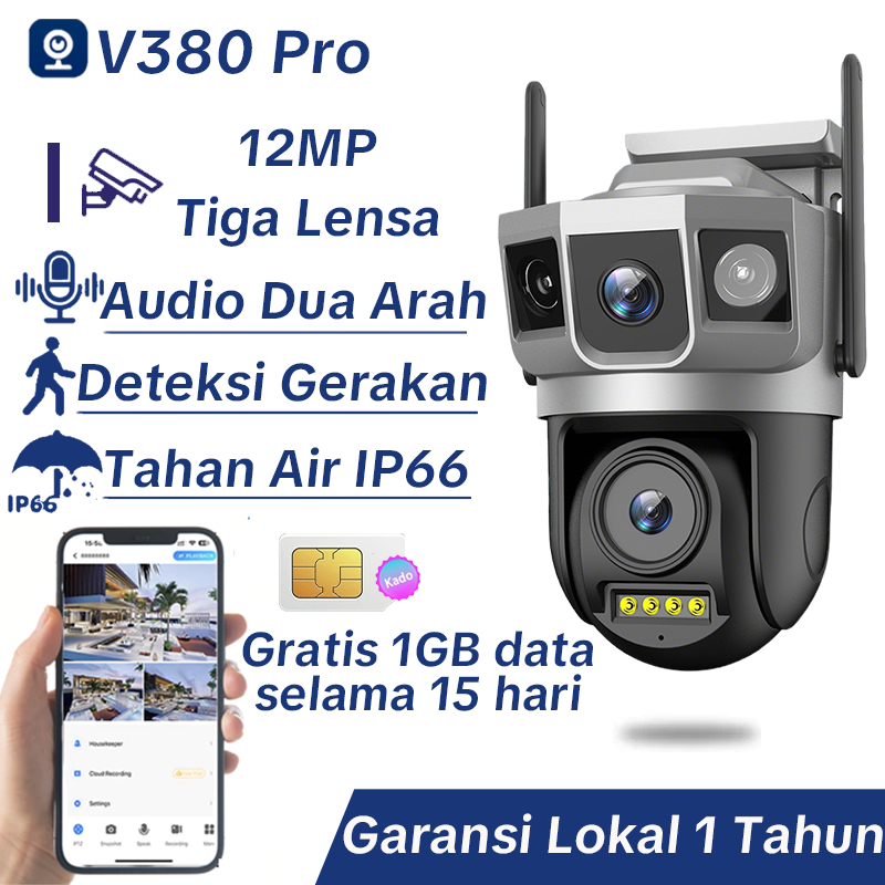 V380 Pro 4G WiFi Outdoor Kamera CCTV 3 Lensa 12MP 1086P Layar Tiga Penglihatan Malam Alarm Zoom 10X