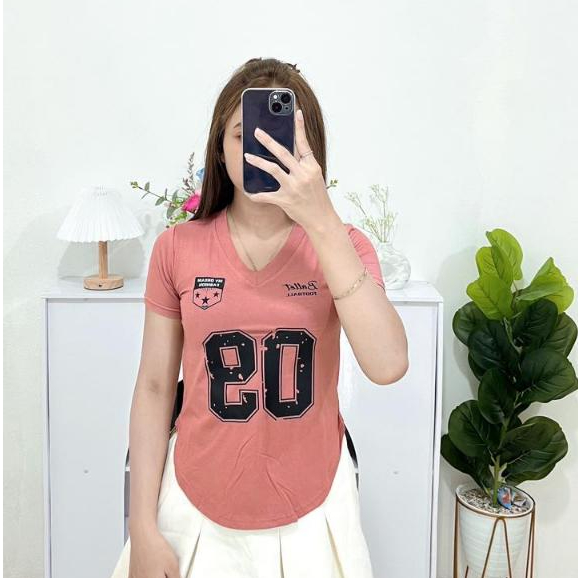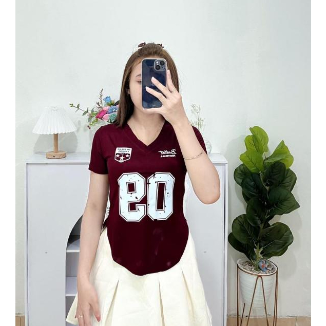Kaos Crop V Neck Wanita Logo Printing Angka Jersey - Baju Cewek Semi Crop Oval Lengan Pendek 6028-09