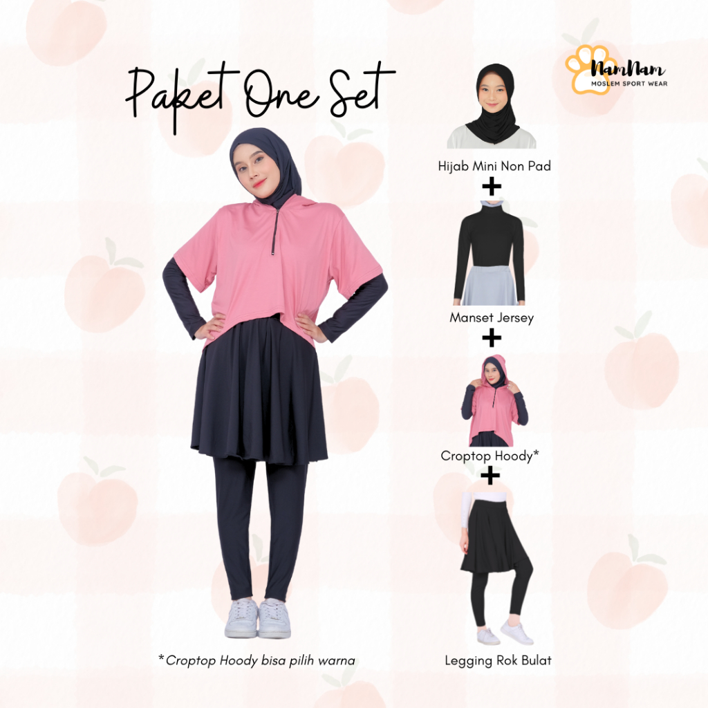 Setelan Olahraga Muslimah Paket Legging Rok + Manset Baju + Hijab + Hoody Croptop