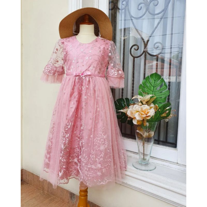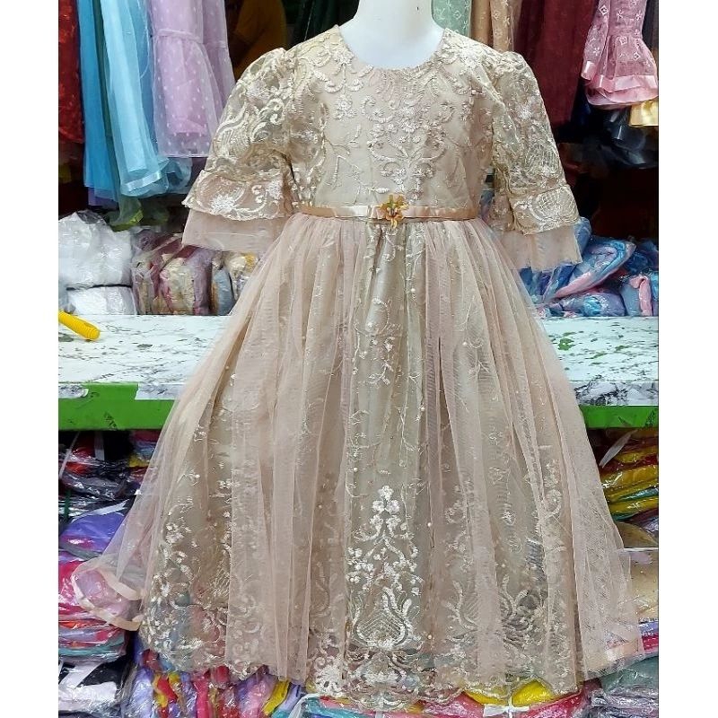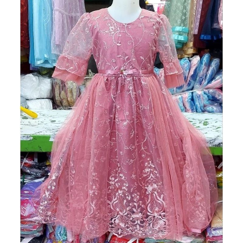 Gaun Pesta Mewah Anak Perempuan Bordir Mutiara Lengan 3/4 Usia 3-12 Tahun
