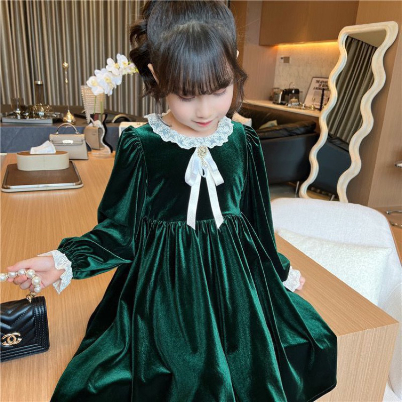 Kh21 Dress Velvet Hijau Brukat Anak Perempuan Lengan Panjang / Gaun Anak Cewek 3-14Tahun / Baju Anak Ukuran Tanggung