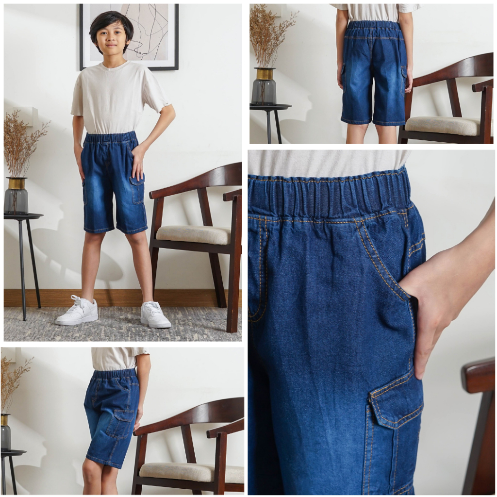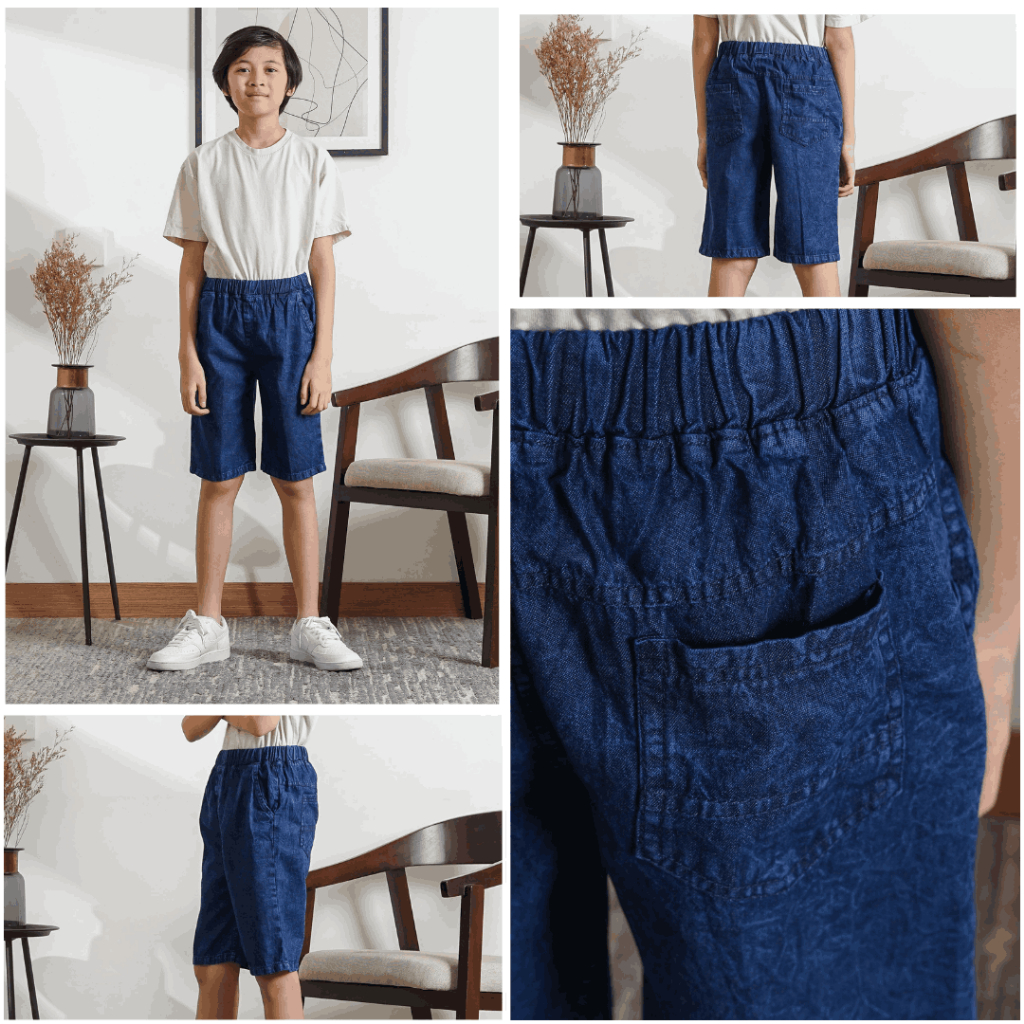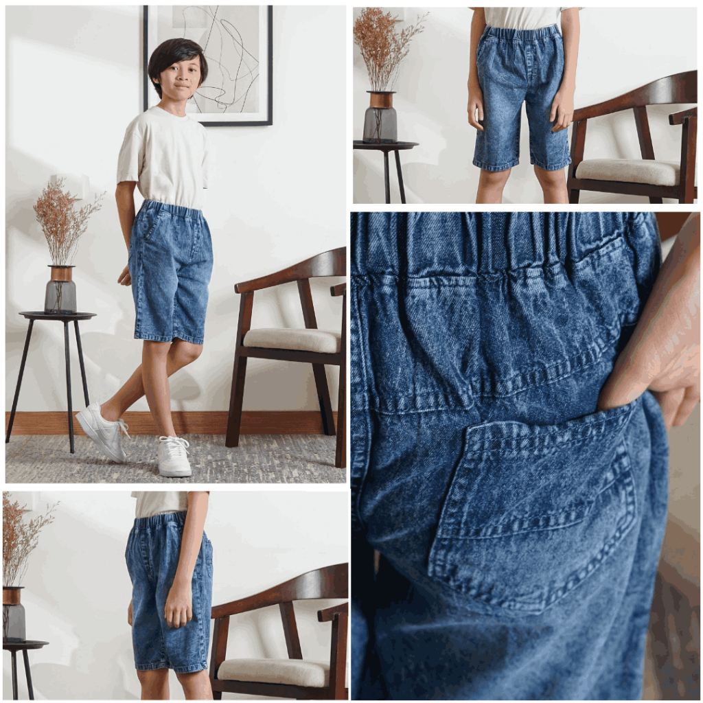 Luckyone Celana Pendek Soft Jeans 3/4 Anak Laki Laki Bahan Denim 6,5 Onz Full Karet Tanpa Resleting Usia 6-12 Tahun