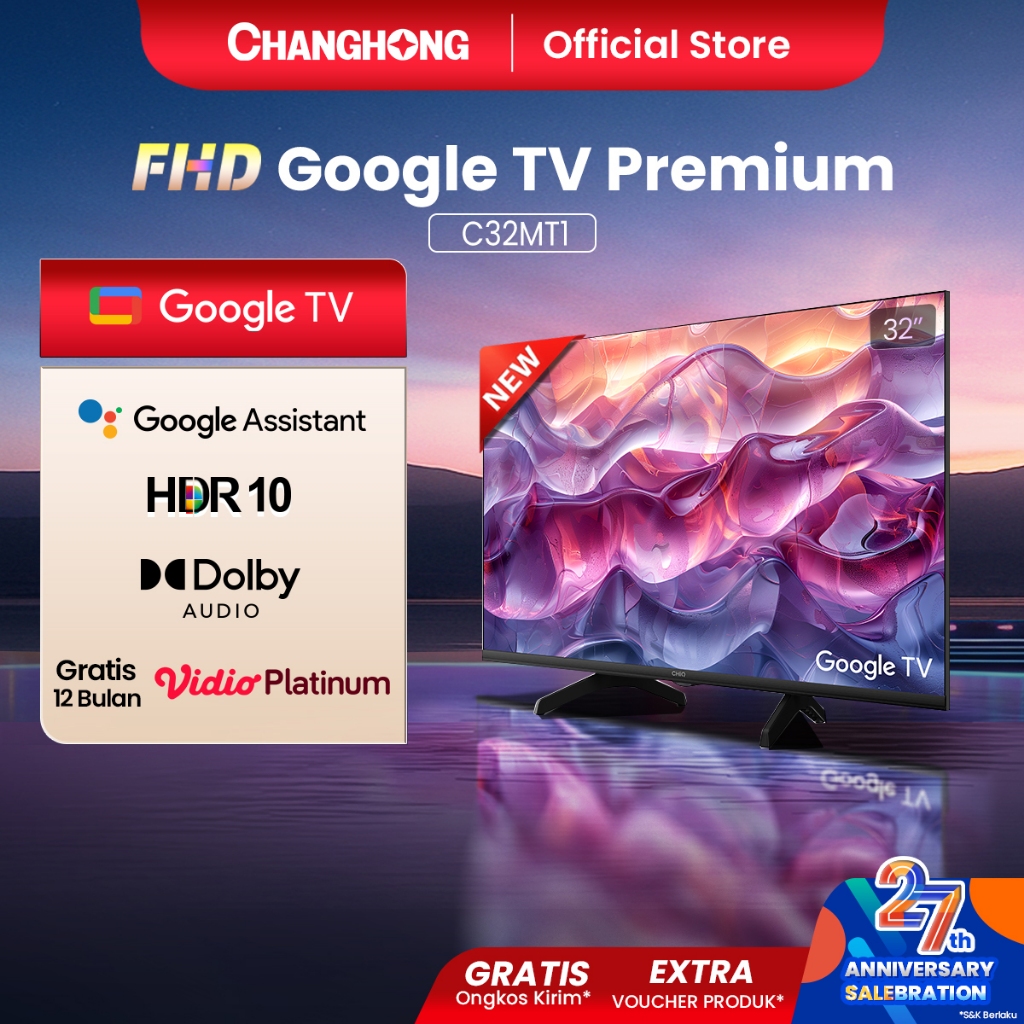 CHiQ by Changhong Google TV 32 inch FHD Google Smart TV Digital TV Dolby Audio DBX-TV Google Play Netflix Youtube Bluetooth USB Google Assistant (C32MT1)