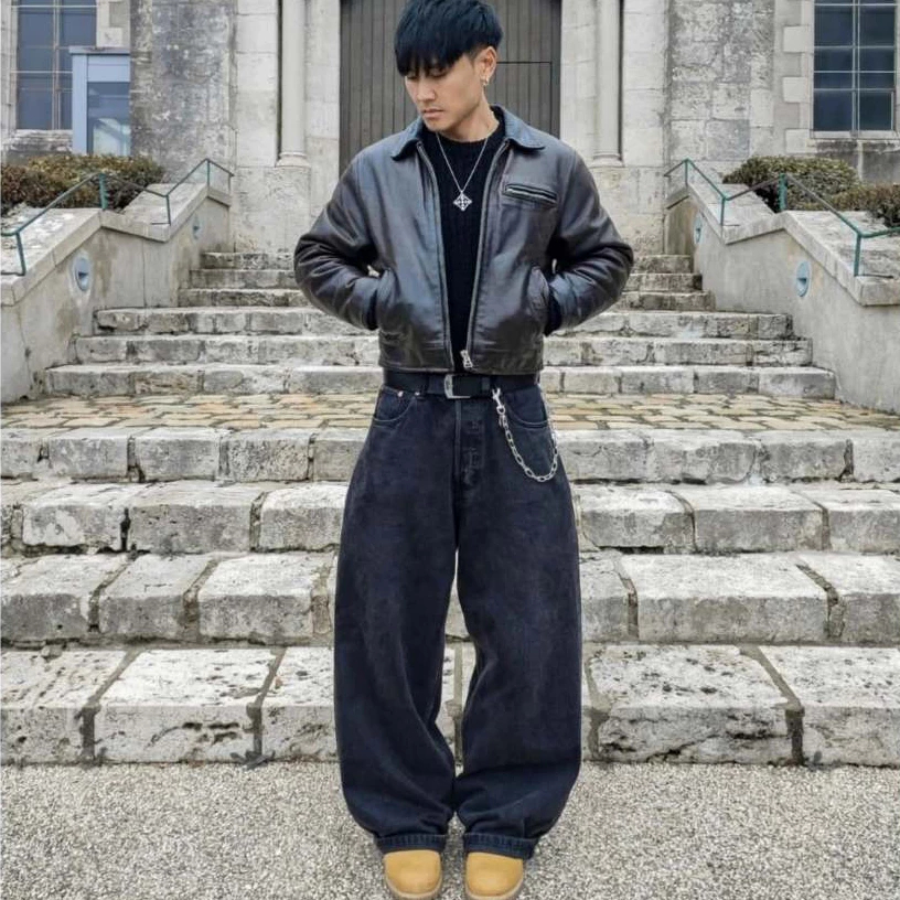 Celana Jeans Loose Baggy Wide Leg Oversize Pria Celana Gombrong Wisker Whisker Skena Y2K Denim Terbaru