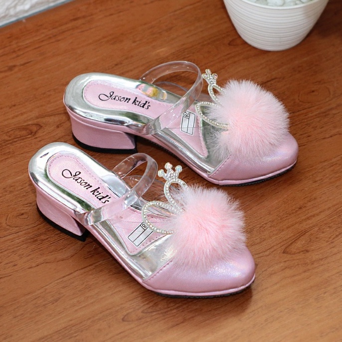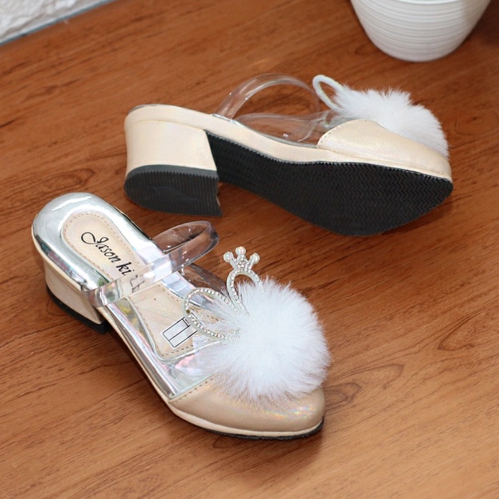 Sandal Sepatu Anak Perempuan Hak 3 Cm Motif Bulu Kitty Mika Bening Heels Selop Pesta Cewe Tahun Sm1