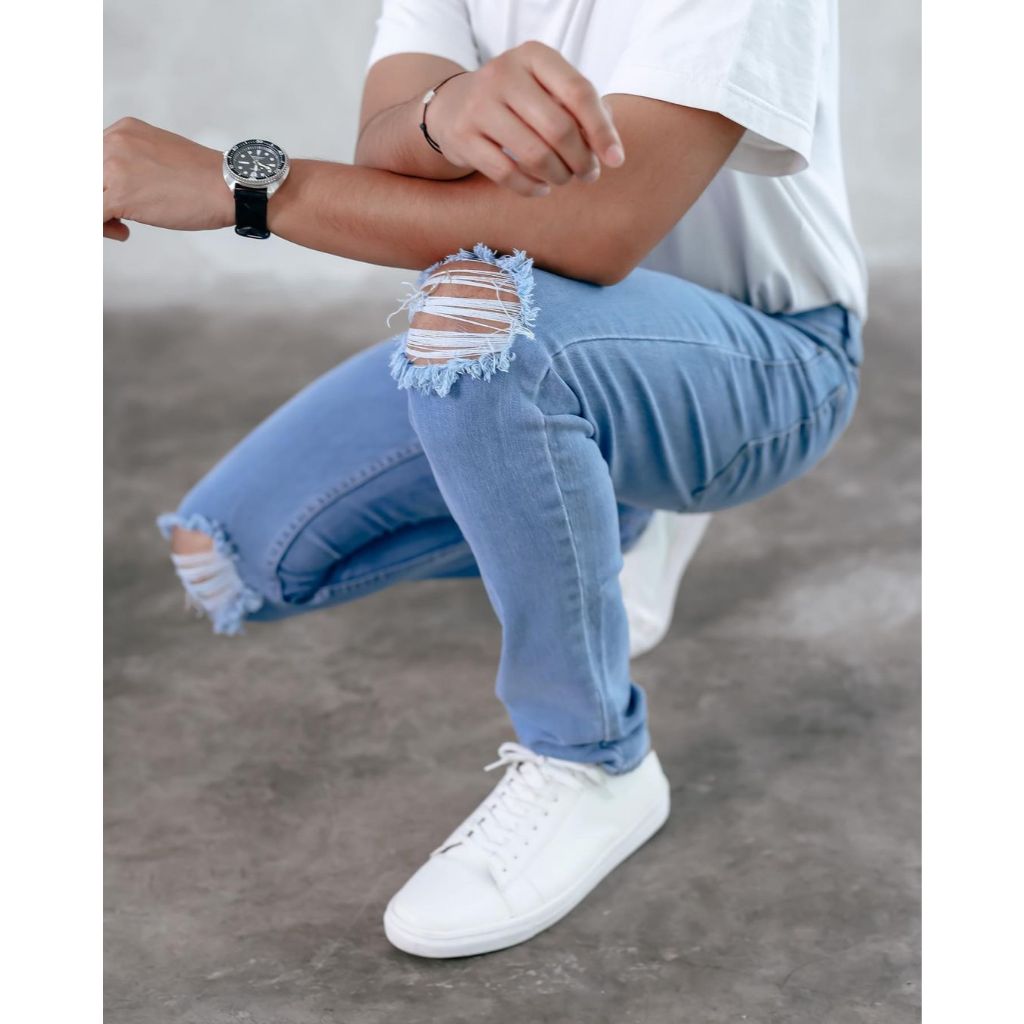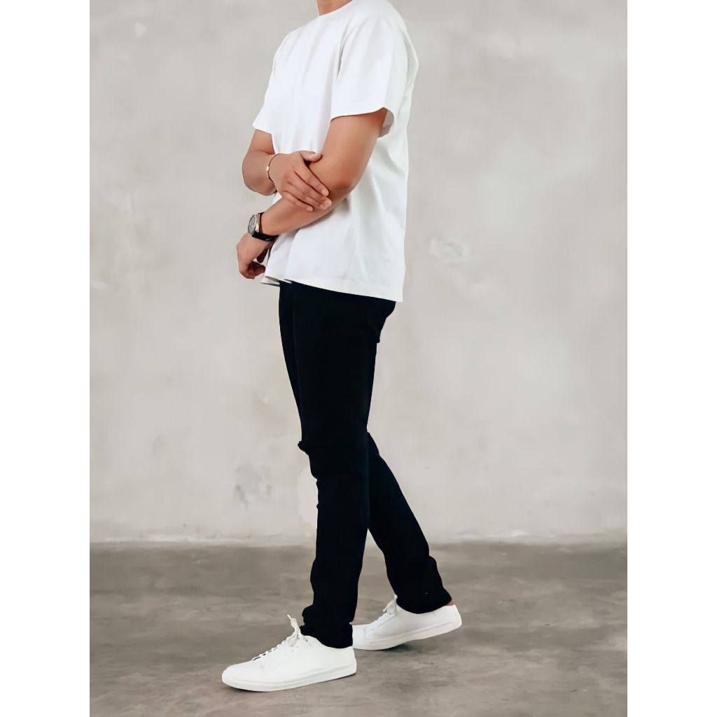 Celana Jeans Panjang Pria Sobek Lutut Slimfit Skynni Pensil Hitam Ripped Denim Stretch Melar