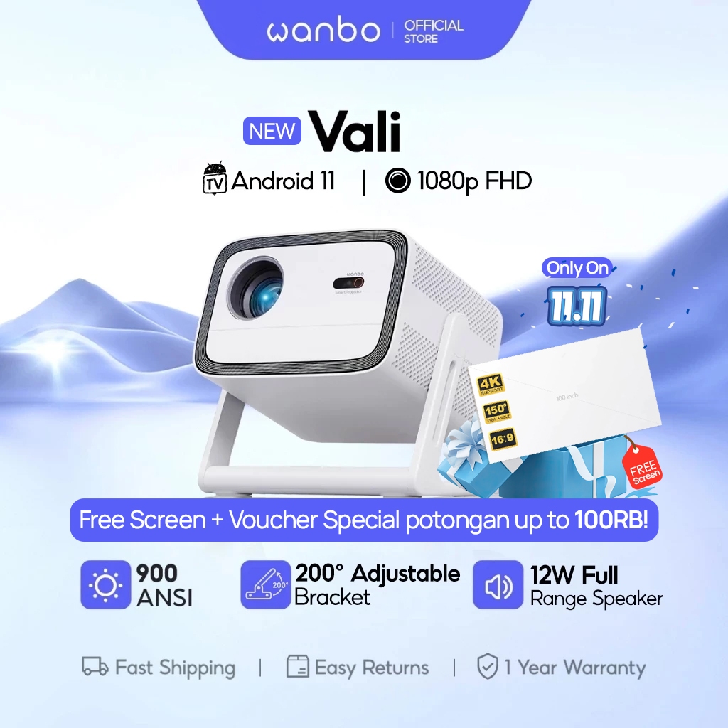 Wanbo Vali (PROMO 11.11) Projector Android TV 11 Netflix 200° Rotating Gimbal Projector 900 ANSI Home Theater Proyektor 12 Watt Full Range Speaker