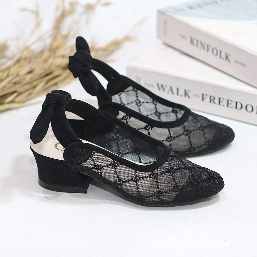 Sepatu Sandal Pesta Anak Perempuan Hak Tahu 3 Cm Brukat Jala Selop Motif Pita