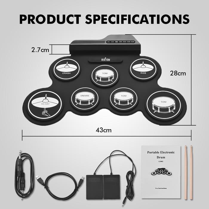 RIXTON PORTABLE ELECTRIC DRUM PAD DIGITAL DRUM SILIKON DENGAN STIK DRUM DAN PEDAL KAKI SUSTAIN - VERSI IKON