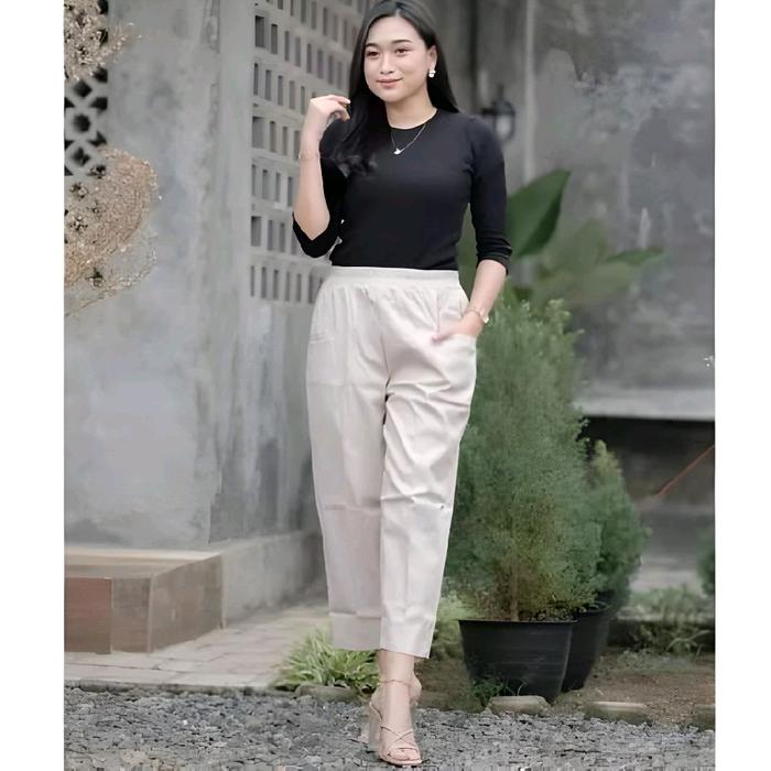 UNICLOO PANTS BAHAN COTTON TWILL SIZE L - XL - XXL - XXXL CELANA PANJANG WANITA 7 8 STYLE PINGGANG FULL KARET STRETCH TEBAL BASIC COMBED DIAM0ND NYAMAN - HITAM, L