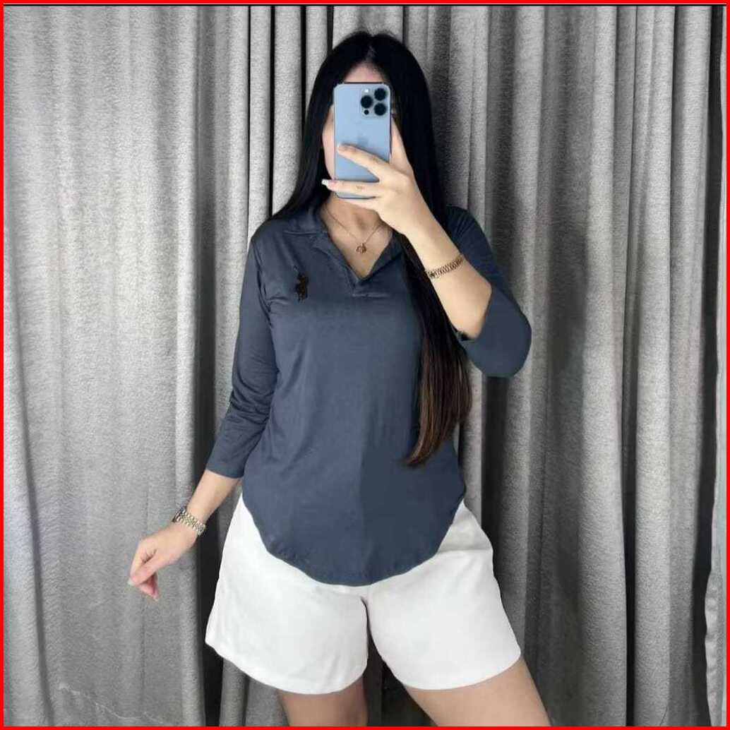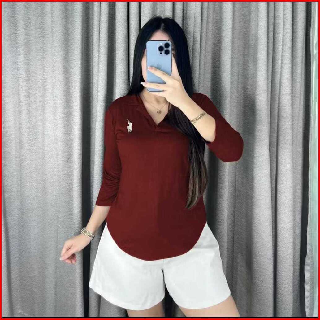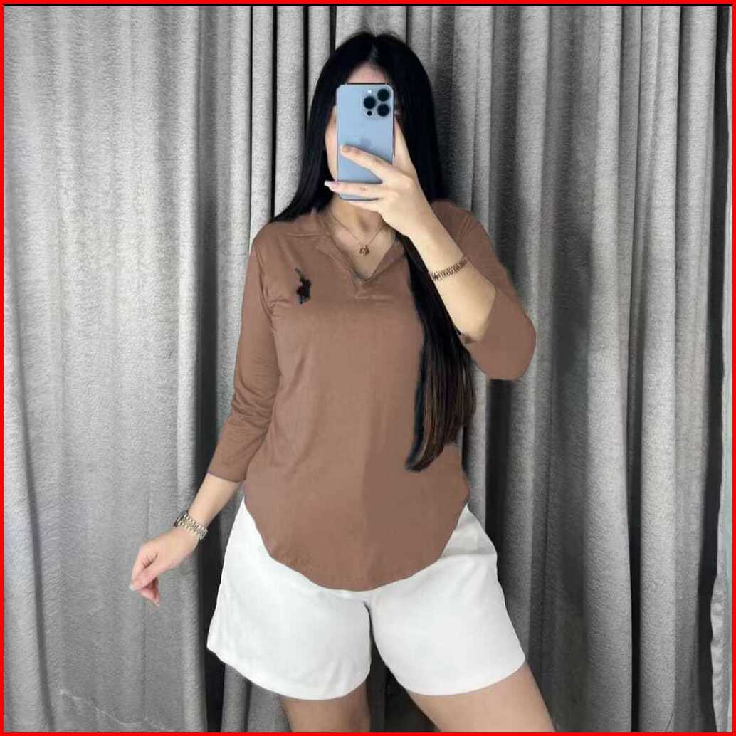 Fd Fashion Kaos Bordir Kerah V Lengan Panjang 7 8 Atasan Polo Oversize Berkerah Wanita 6073