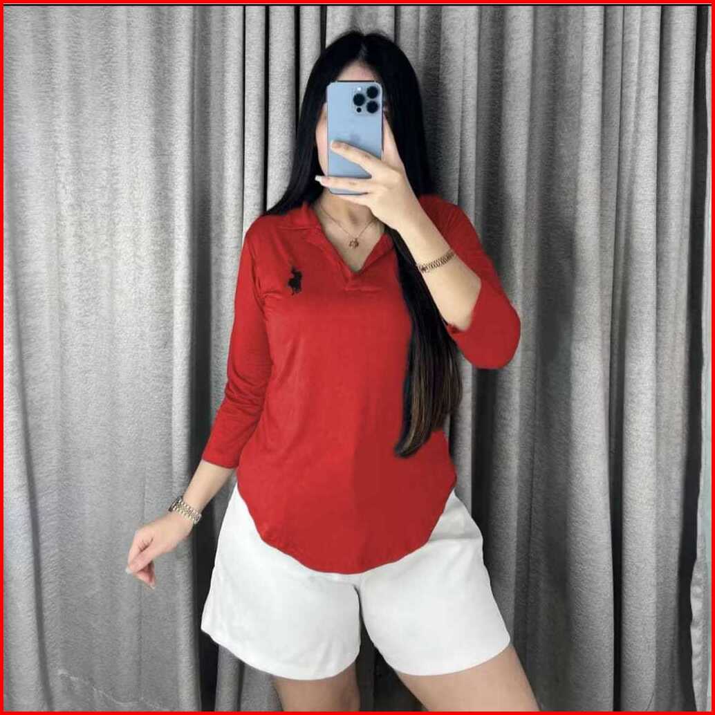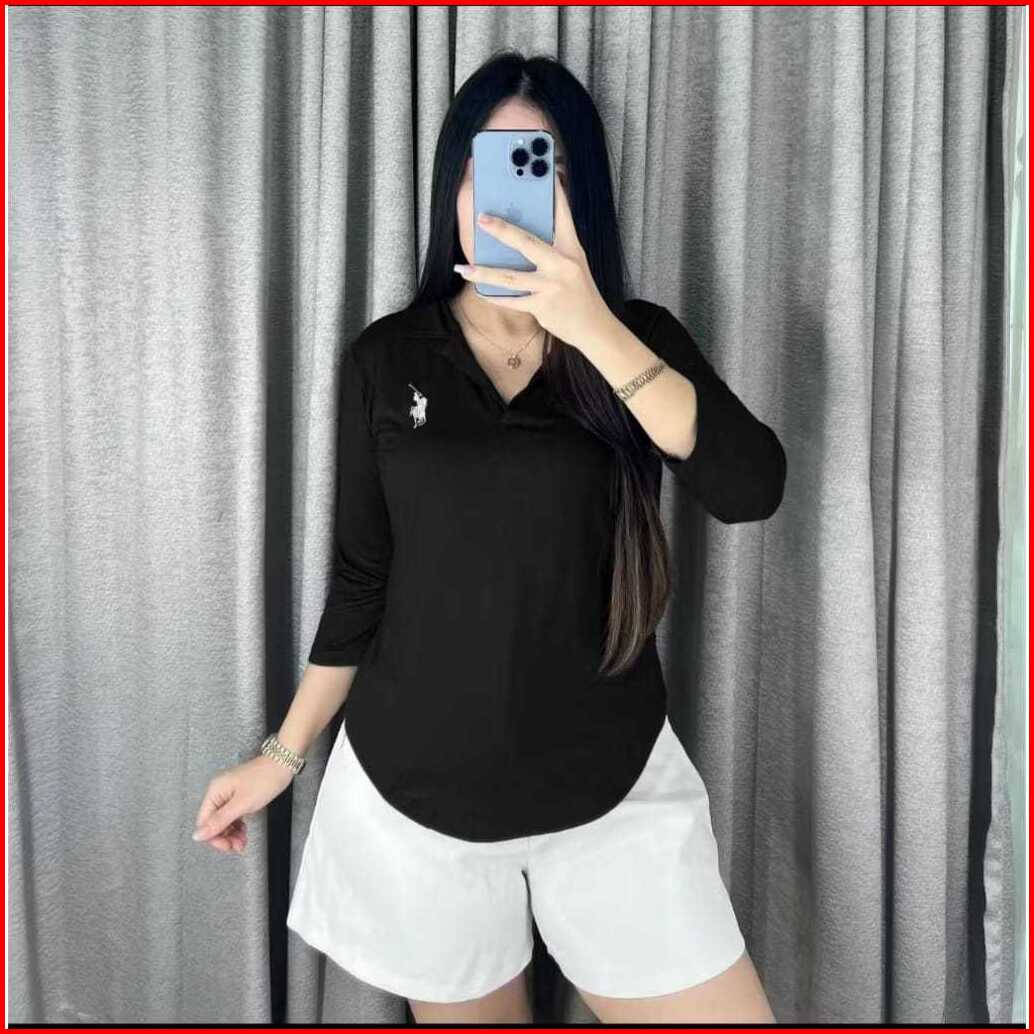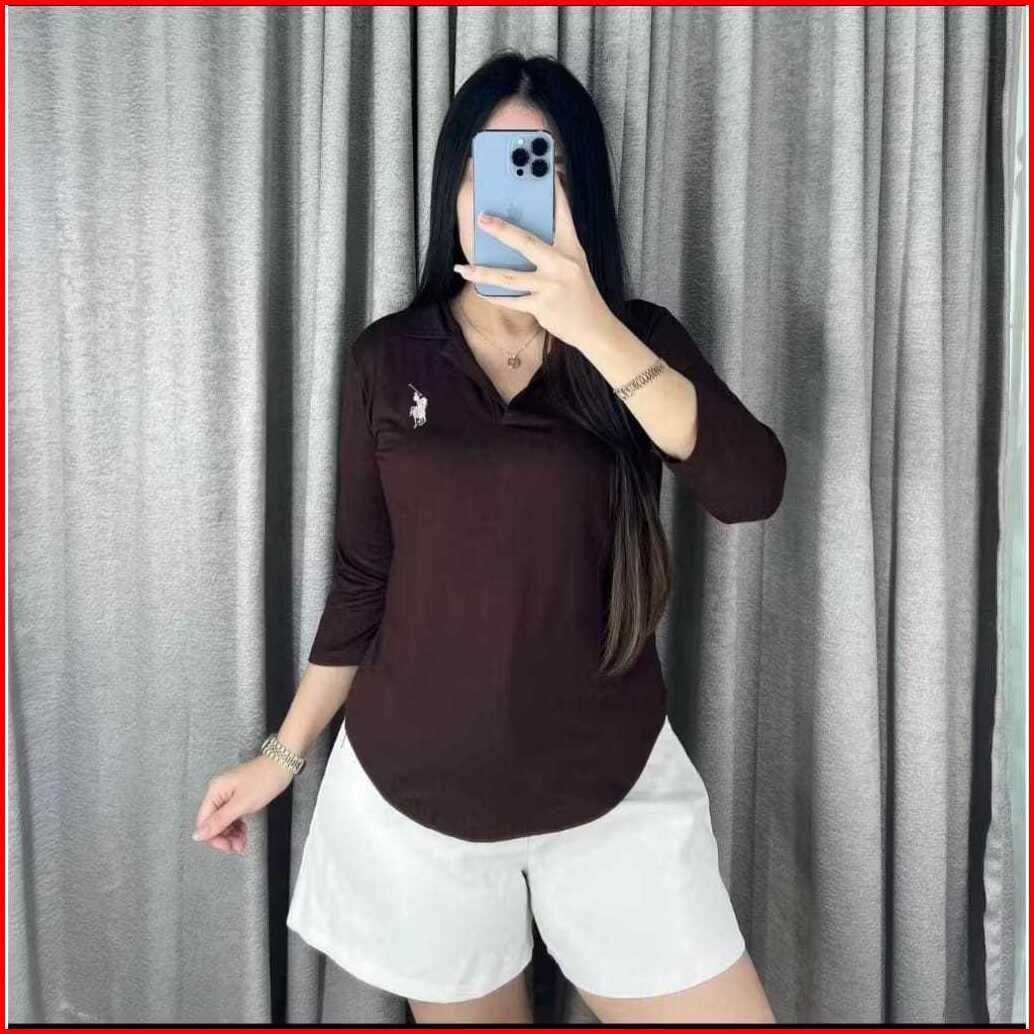 Fd Fashion Kaos Bordir Kerah V Lengan Panjang 7 8 Atasan Polo Oversize Berkerah Wanita 6073