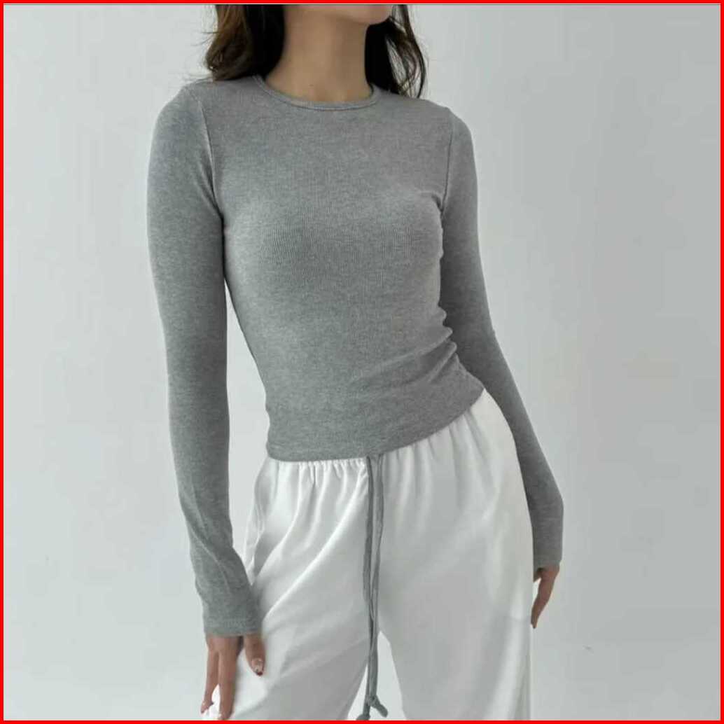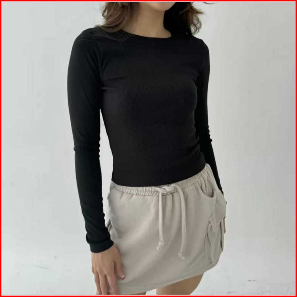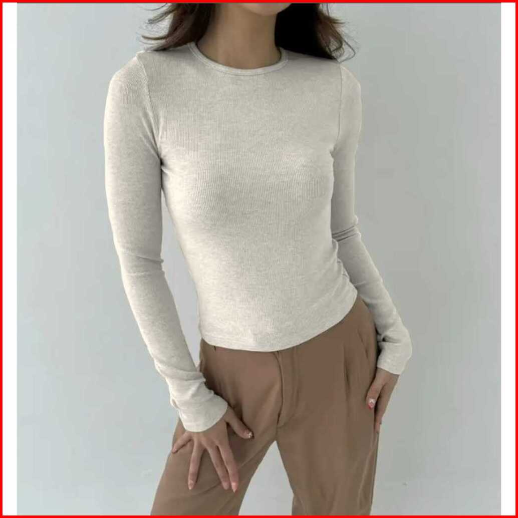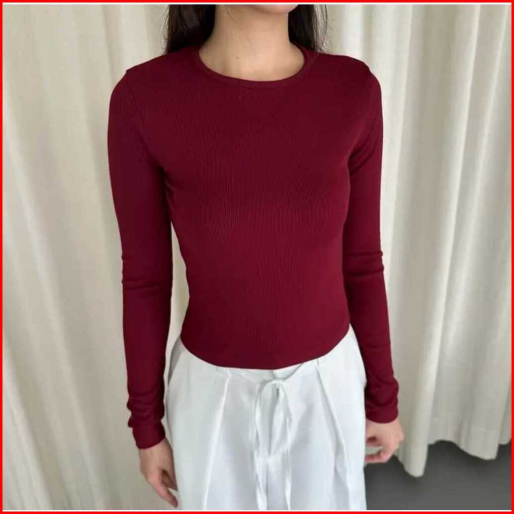 Kaos Ribbed Oneck Top Knit Rib Atasan Wanita Polos Lengan Panjang