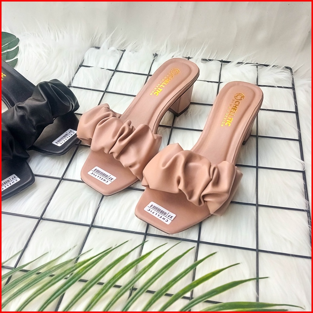 High Heels Wanita Aksen Kerut Sandal Hak Tahu 5cm Chelltic 07 Sendal Wanita Kekinian Terbaru Murah Wedges Wanita 5cm Sep