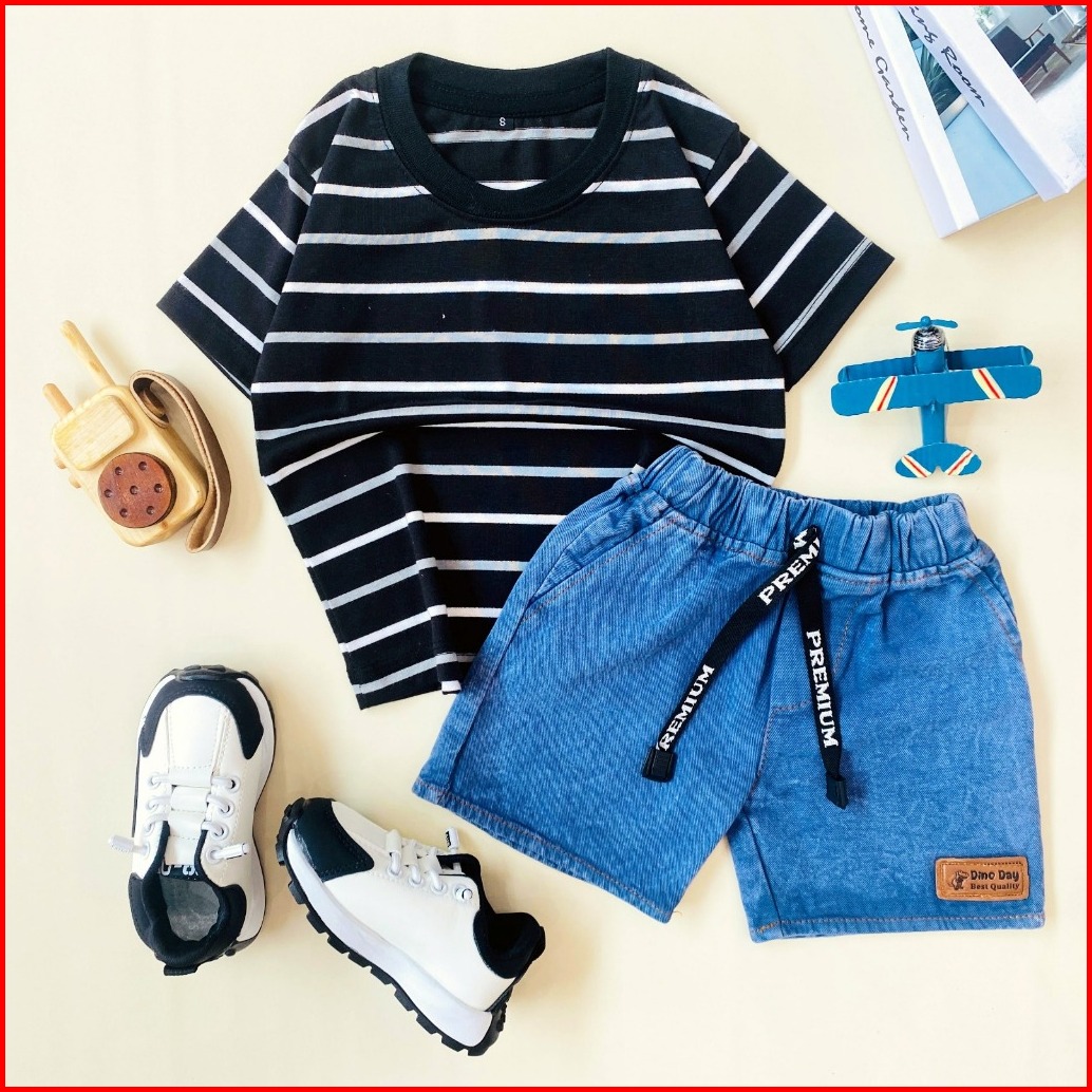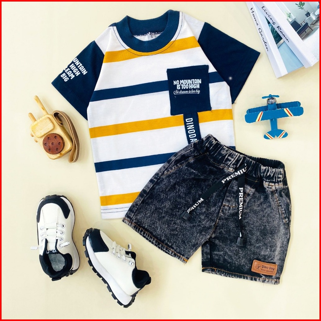 Striblykids X Estishop Setelan Baju Anak Laki Laki Kaos Salur Stripe Bayi Celana Jeans Pendek