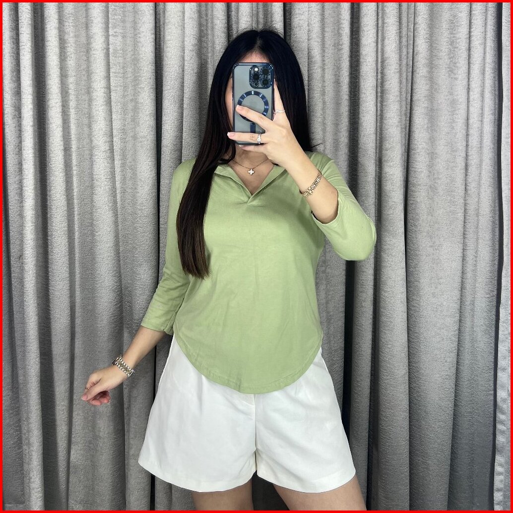 Olive Atasan Kerah V Lengan Panjang Spandek Rayon