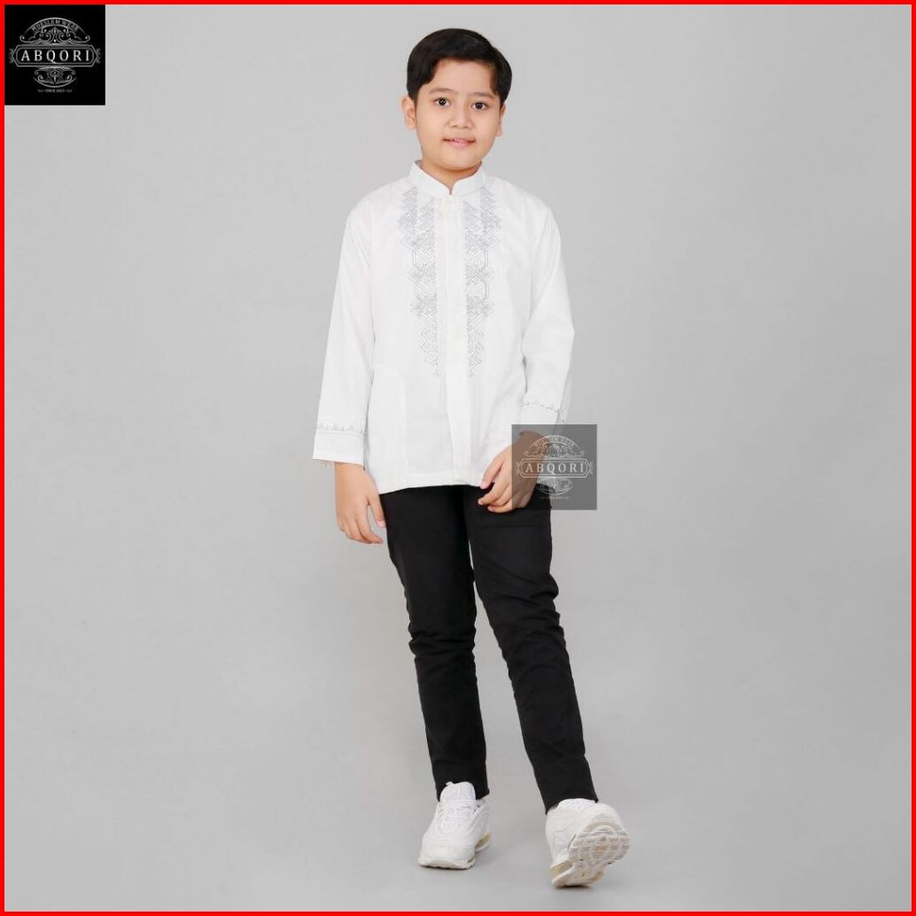 Baju Koko Anak Remaja Tanggung Lengan Panjang Fashion Muslim Anak Laki Laki Bahan Katun Toyobo Warna Putih Tulang Bordir