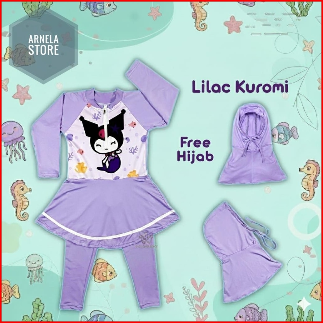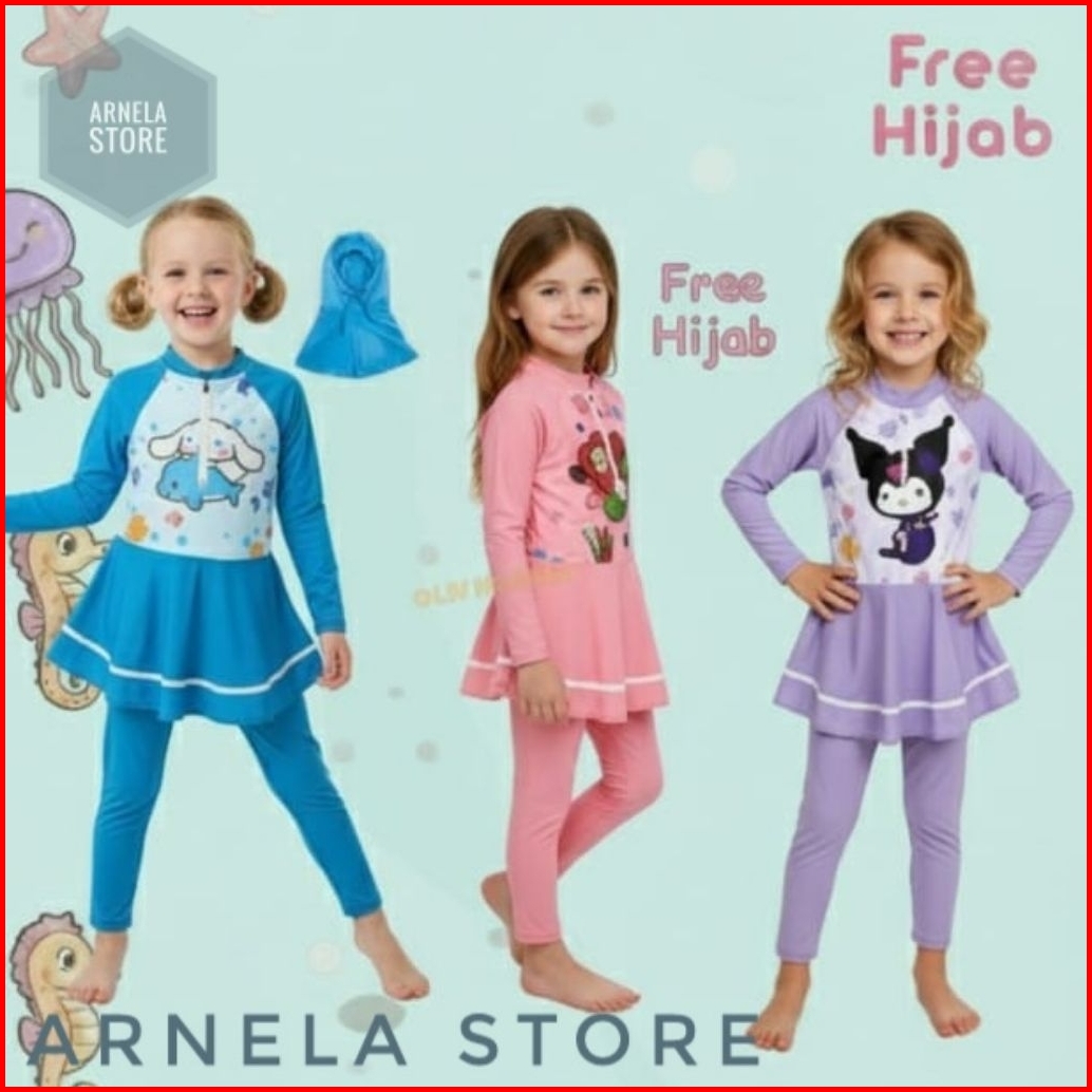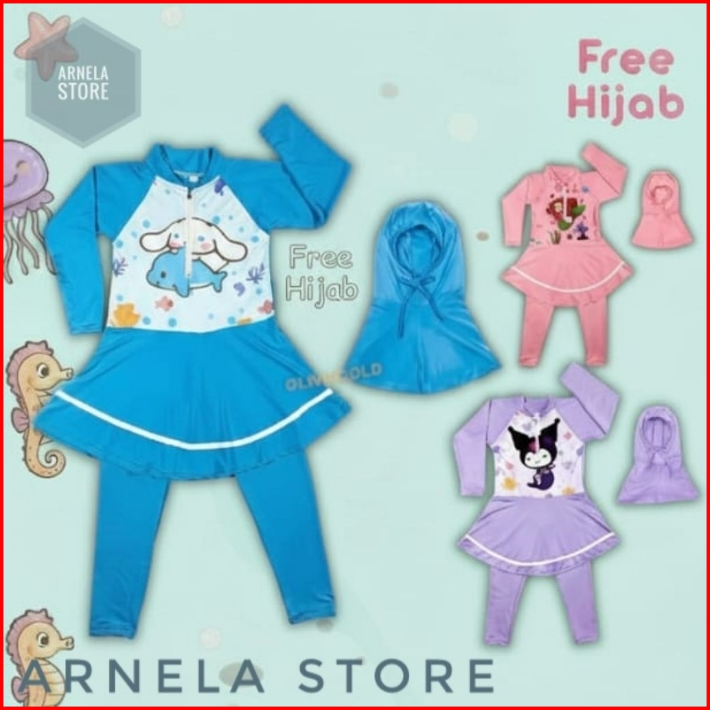 Arnela Baju Renang Anak Karakter Rok Inner Panjang Free Hijab Spandek Premium Lucu Imut Bonus