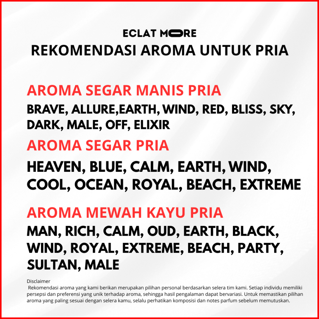 SHINE (Unisex), SOULMATE (Unisex), LOVE (Unisex), MAN (Pria), BRAVE (Pria), BLOSSOM (Unisex), FRESH (Unisex), BLOOM (Unisex), AURA (Unisex), BREEZE (Unisex), HEAVEN (Pria), ECLAT (Unisex), JUICY (Unisex), CANDY (Unisex), SUNSET (Unisex), RICH (Pria), ADORE (Unisex), SUNNY (Unisex), LUSH (Unisex), TOGETHER (Unisex), TIMELESS (Unisex), MYSTIQUE (Unisex), ALLURE (Unisex), FUN (Unisex), CALM (Pria), VANILLA CAKE, GOOD GIRL (Unisex), BLUE (Pria), SWEET (Unisex), PARIS (Unisex), SUMMER (Unisex), LOVELY (Unisex), HEART (Unisex), VANILLA POPCORN, BUBBLEGUM (Unisex), GREEN TEA (Unisex), JASMINE (Unisex), S.O.T.B (Unisex), OUD (Pria), VANILLA MILK, EARTH (Pria), BLACK (Pria), ROSE (UNISEX), DREAM (UNISEX), WIND (Pria), SWEETHEART, COOL (Pria), OCEAN (Pria), ROYAL (Pria), RED (Pria), BEACH (Pria), BLISS (UNISEX), BOSS (UNISEX), EXTREME (Pria), PARTY (Pria), SKY (UNISEX), SULTAN (PRIA), DARK (UNISEX), MALE (PRIA), OFF (UNISEX), ELIXIR (PRIA)