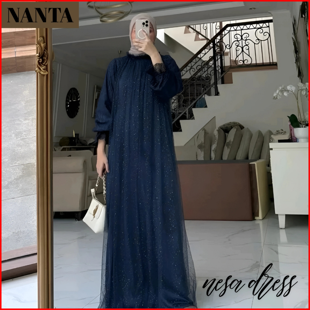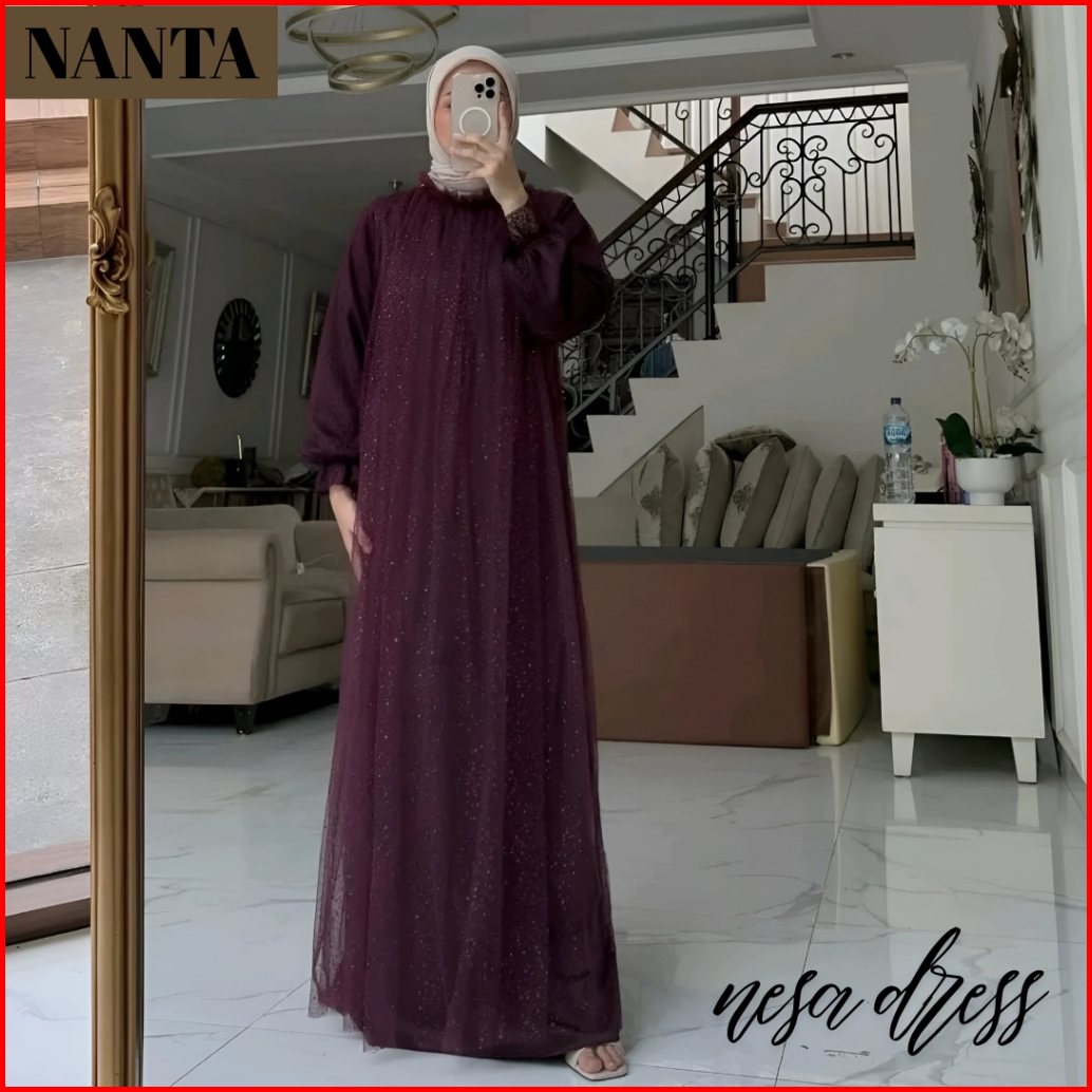 Baju Kondangan Wanita Nesa Dress Silk Coklat Mahogany Brukat Tulle Raindrops Gamis Pesta Elegant