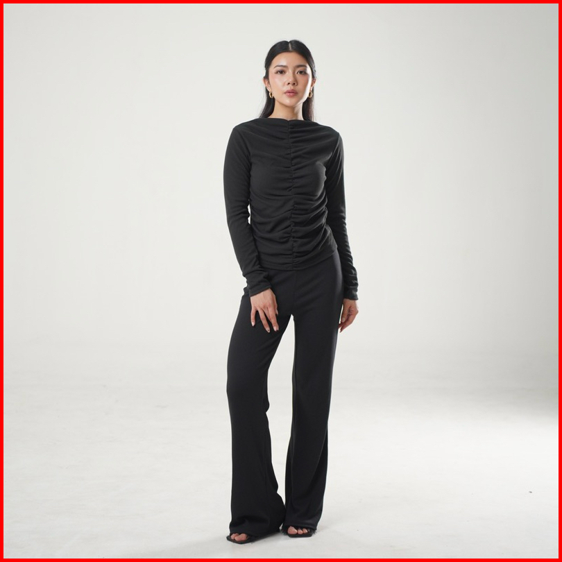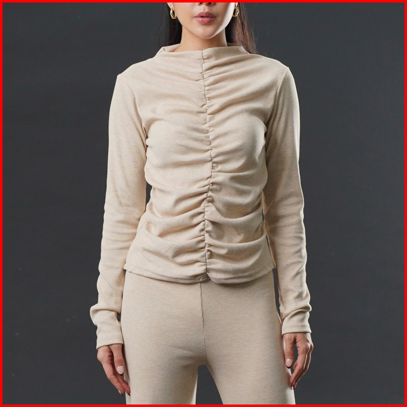 Klaus Top Atasan Knit Wanita Lengan Panjang Ruched Pleated Rample Basic Korean Top Summer Baju Knit Rib Wanita Long Slee