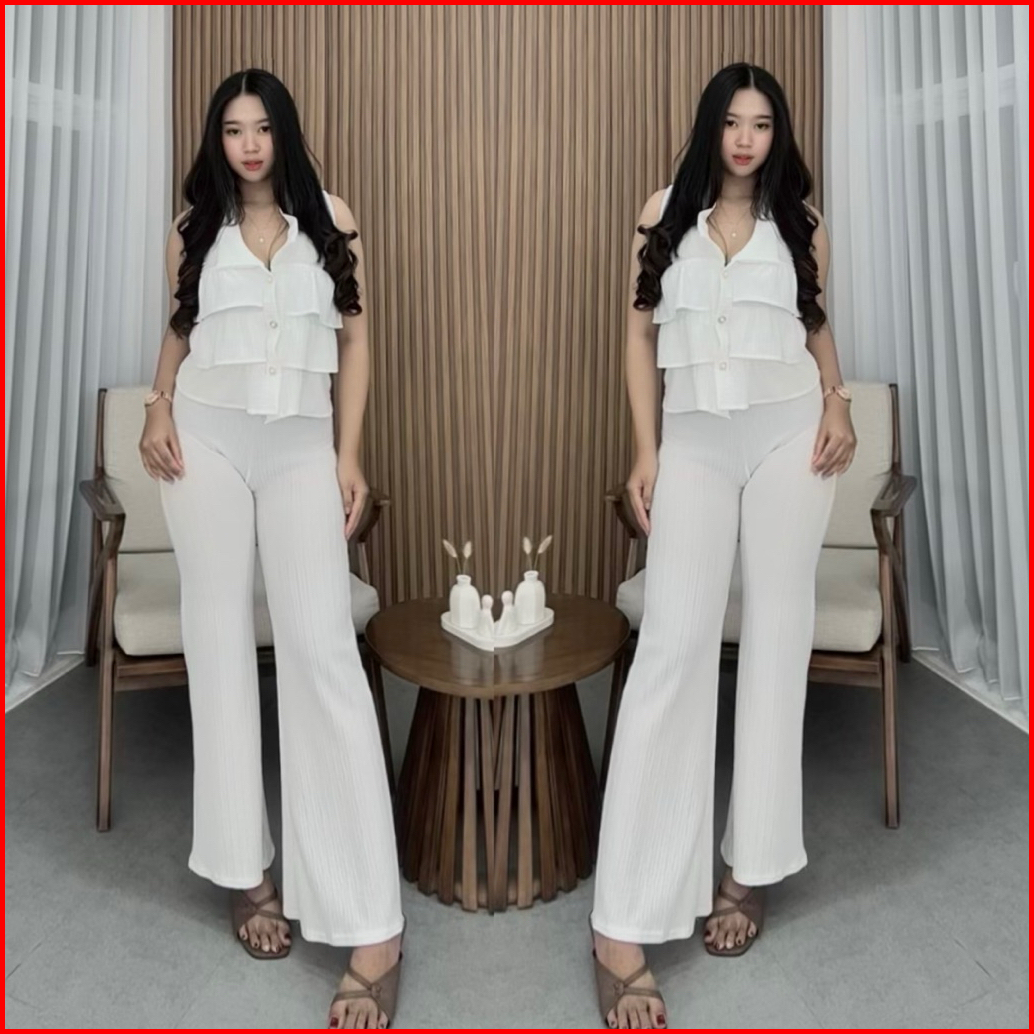 Hoki - Lisa Setelan Wanita Atasan Layer Celana Panjang Cutbray Oneset Kekinian 2025 Atasan Kancing Casual Warna Cokelat