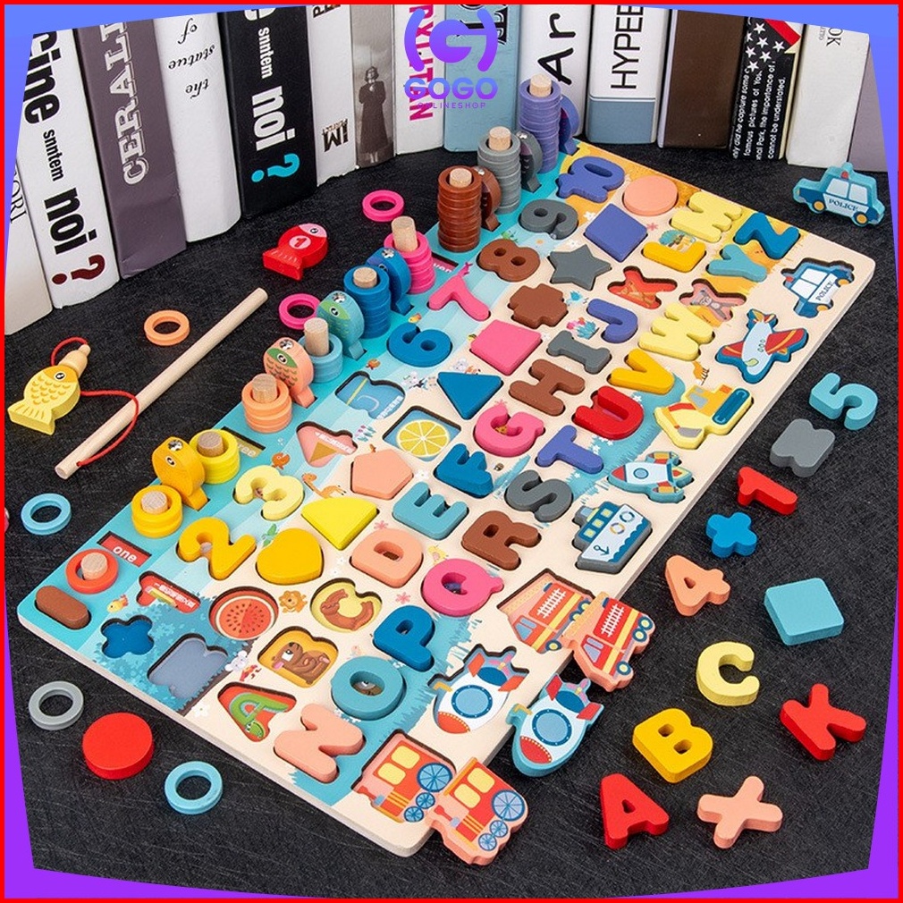Gogo-m94 Mainan Edukasi 7in1 Puzzle Kayu Anak Huruf Dan Angka Pancing Ikan Montessori Wooden Toys