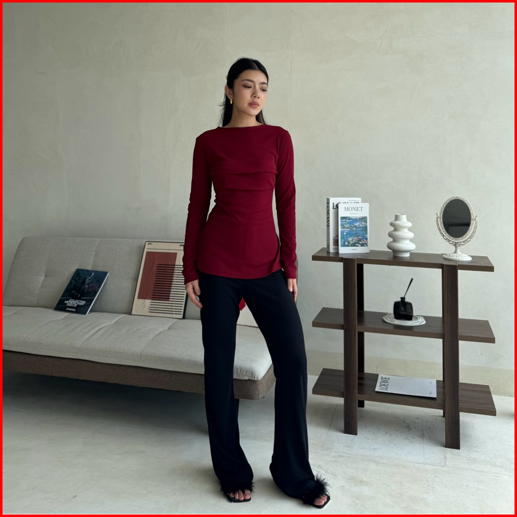 Uri Top - Atasan Knit Wanita Lengan Panjang Rample Rutched Basic Korean Top Summer Baju Knit Kancing Rib Wanita Long Sle