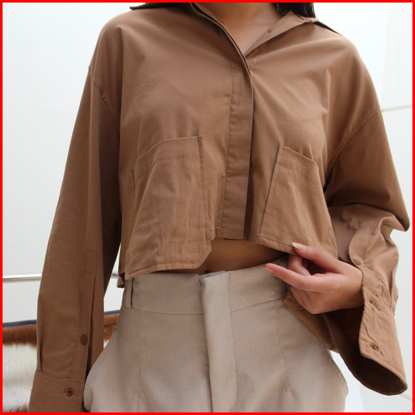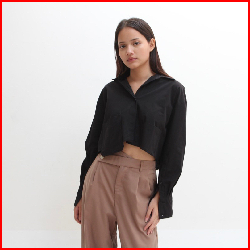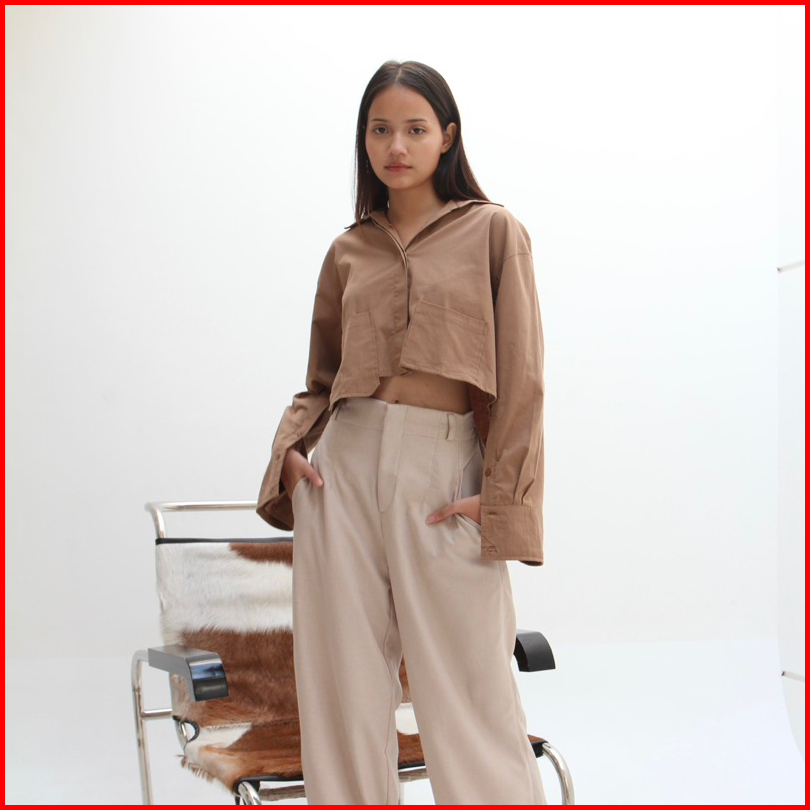 Hazel Top Kemeja Oversized Semi Crop Wanita Lengan Panjang Long Sleeve Shirt Crop Blouse Wanita Cropped Kemeja Tangan Pa