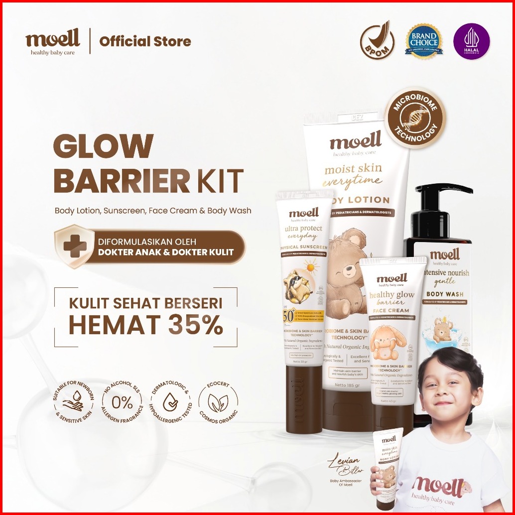 Moell Glow Barrier Kit Body Lotion 185gr Face Cream 40gr Physical Sunscreen 30gr Body Wash 185gr - Skincare Perlindungan