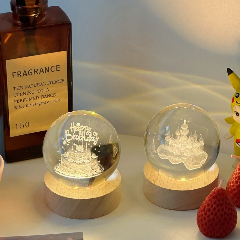 Lampu Tidur Bola Kristal Happy Birthday Hiasan Meja Led Dekorasi Kamar Tidur Aesthetic Hadiah Cahaya Hangat/Warni