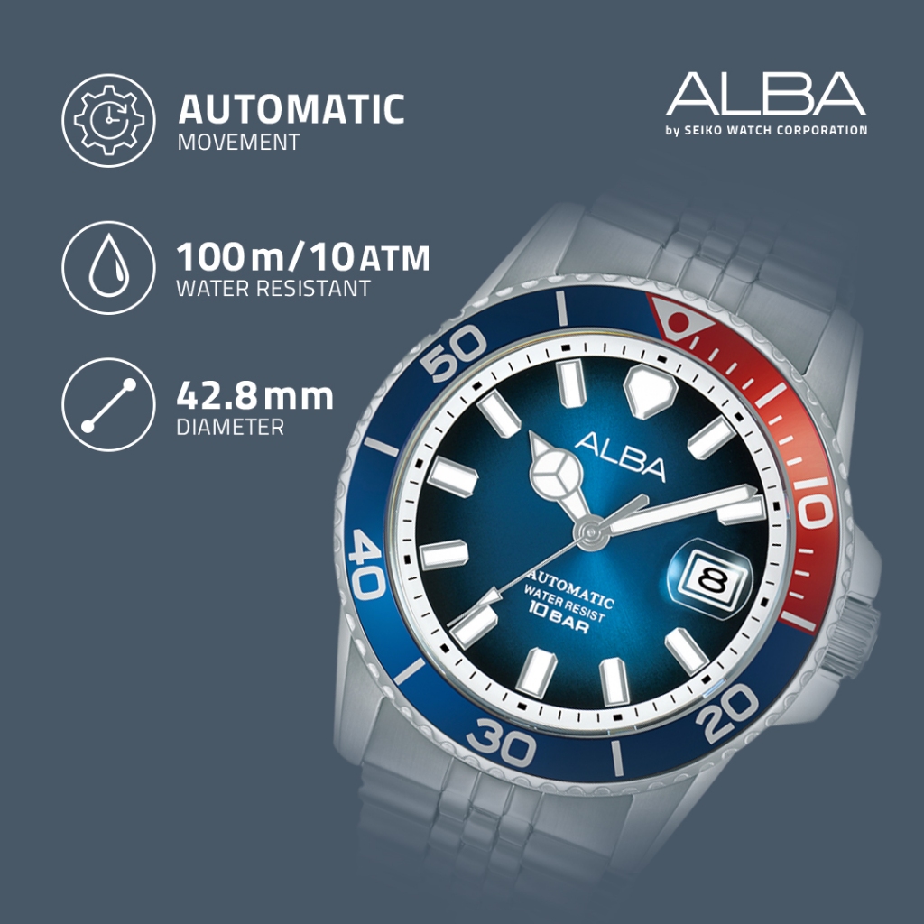 Jam Tangan Pria Alba Mechanical AU4051 / AU4051X1 Automatic Blue Dial Red Bezel Stainless Steel Strap Watch - Official