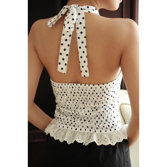 Peach Poppy ELIORA Halter - Halter Top With Lace Ruffle Halter Tanktop Atasan Wanita - WHITE POLKA