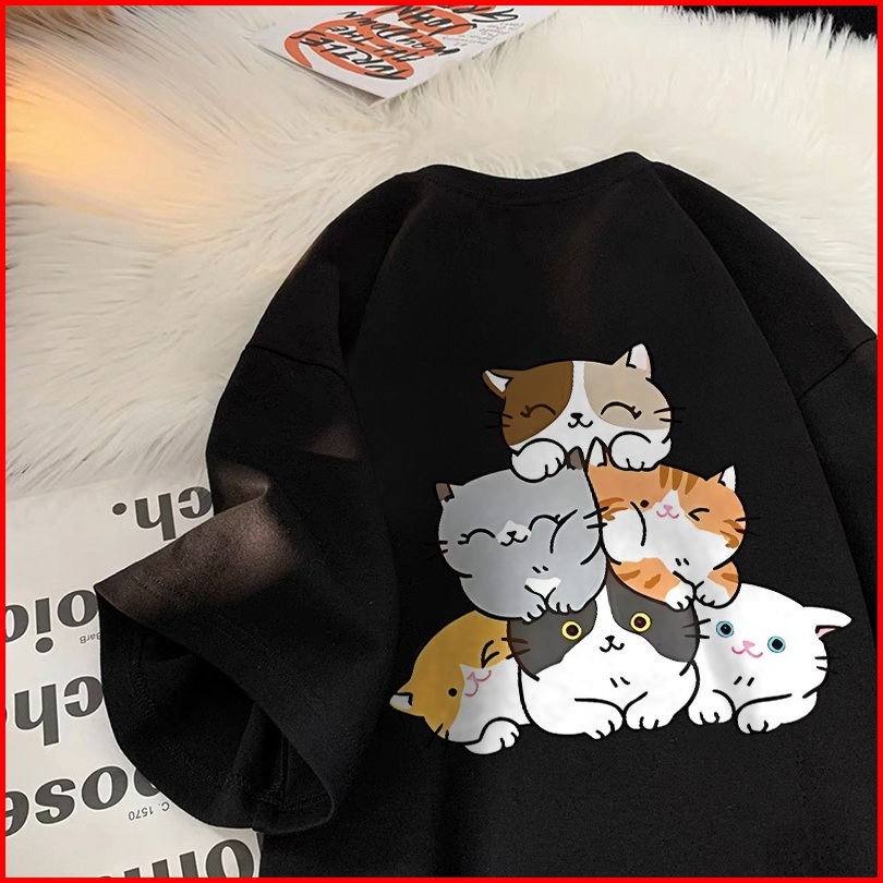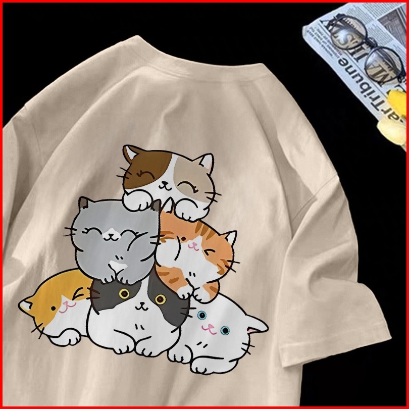 Forteid T-shirt Washed Oversize Pita Cetakan Pola Kucing Lucu Baju Atasan Lengan Pendek Wanita Kaos Oversize Terbaru Kao