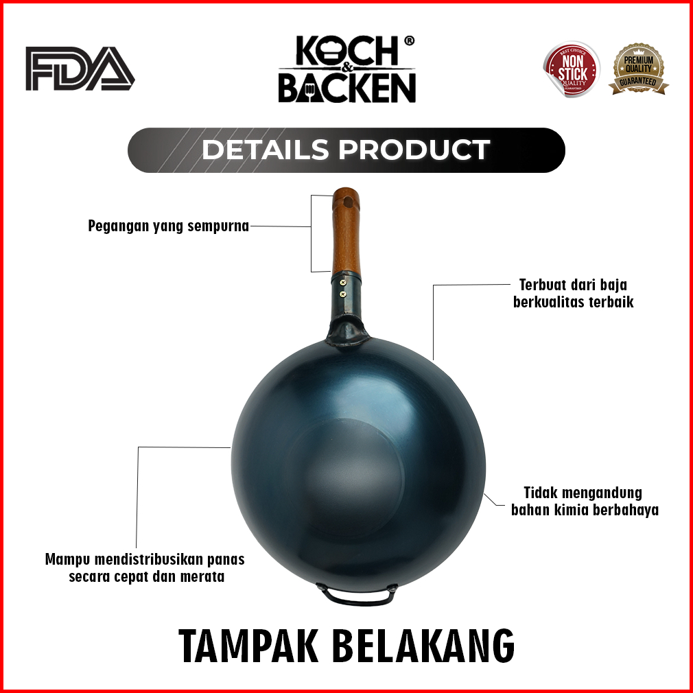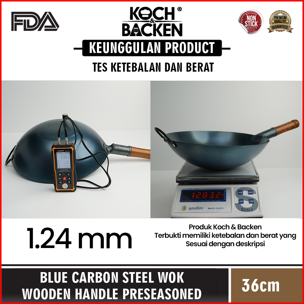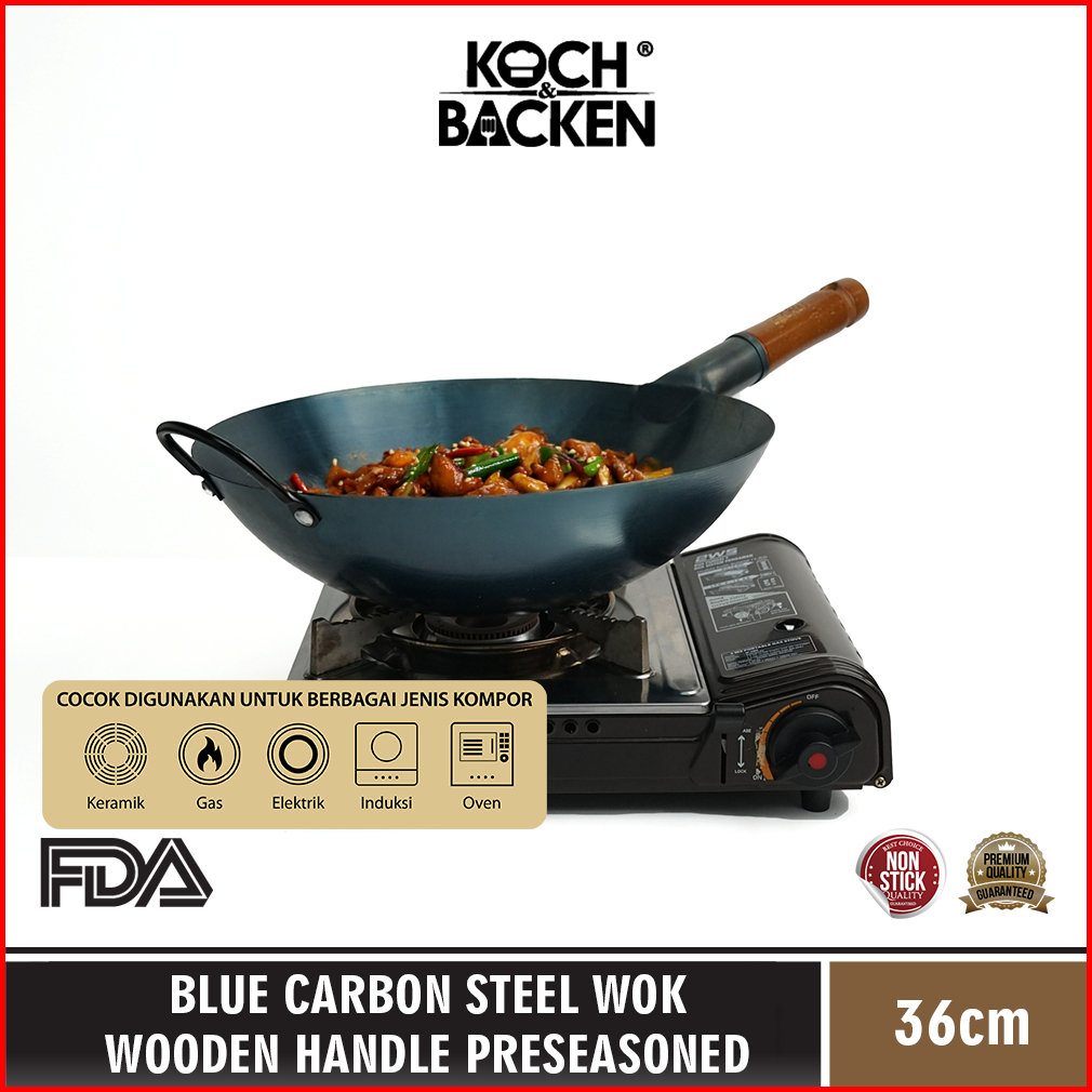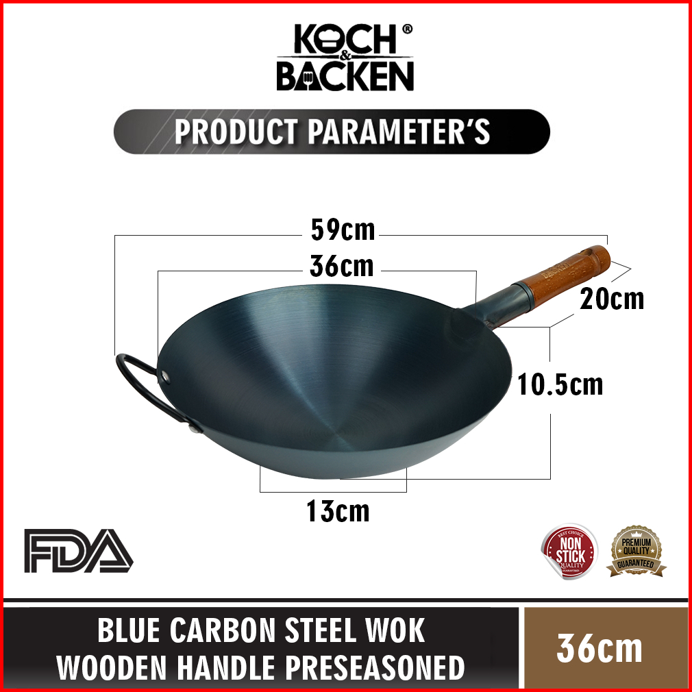 Koch Backen Blue Carbon Steel Wok Wooden Handle Preseasoned 36cm - Wajan Kuali Penggorengan Baja Gagang Kayu Anti Lengke