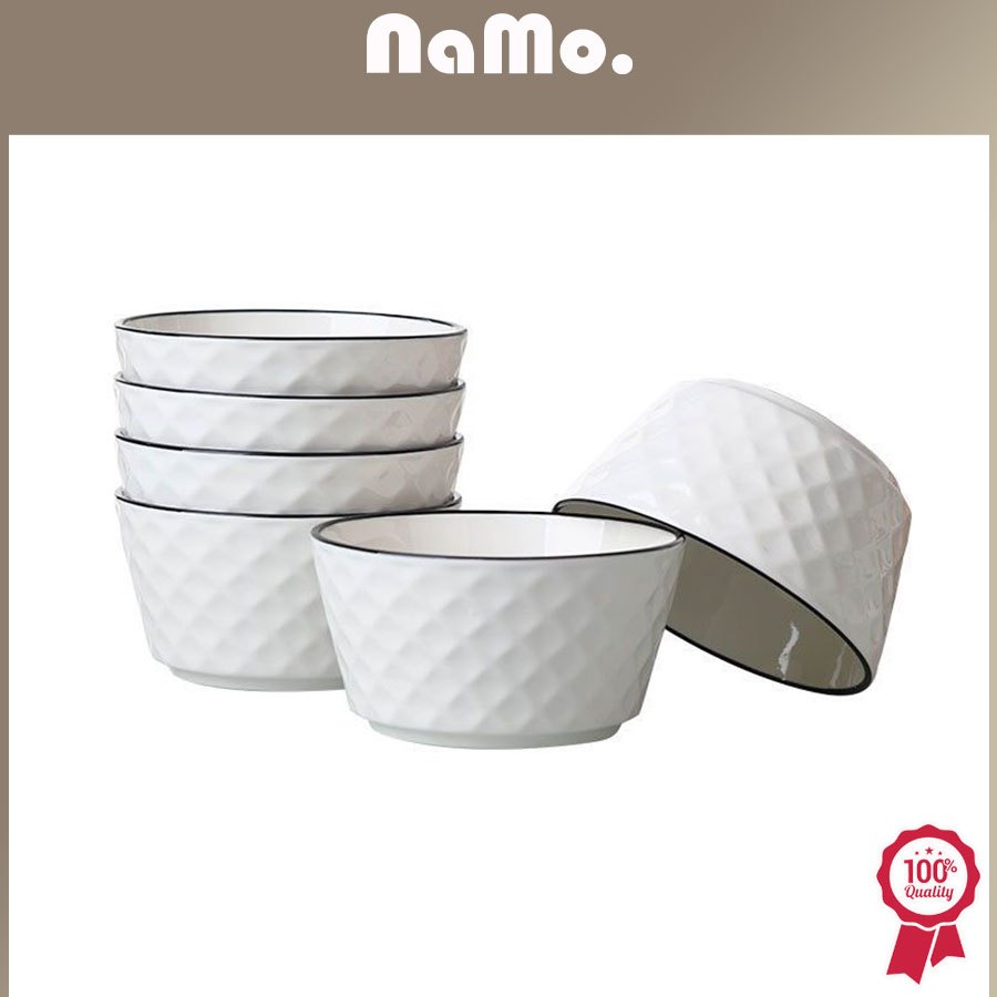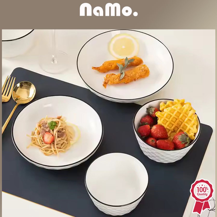 Namo Gift - 6PCS Piring & Mangkuk Keramik Putih List Black Elegan/Piring Style Diamond Pattern Mewah