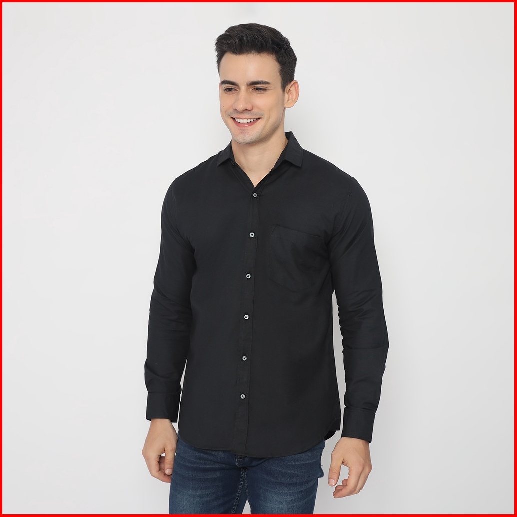 Fichino Kemeja Pria Basic Polos Lengan Panjang Hitam