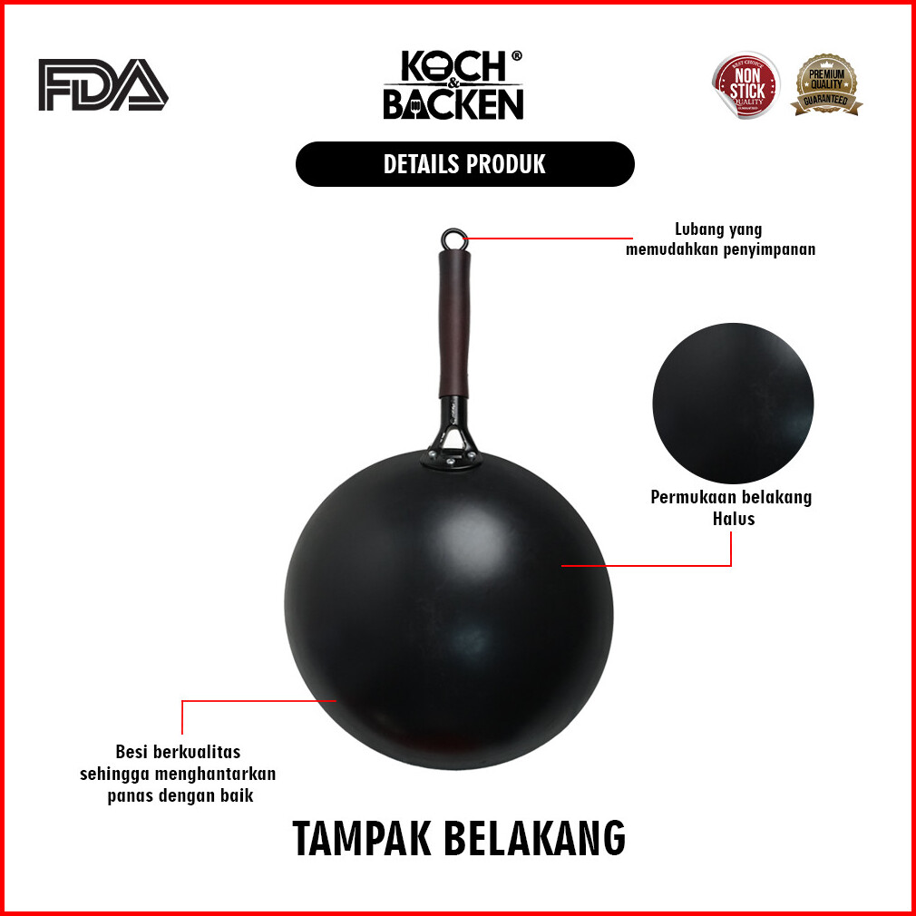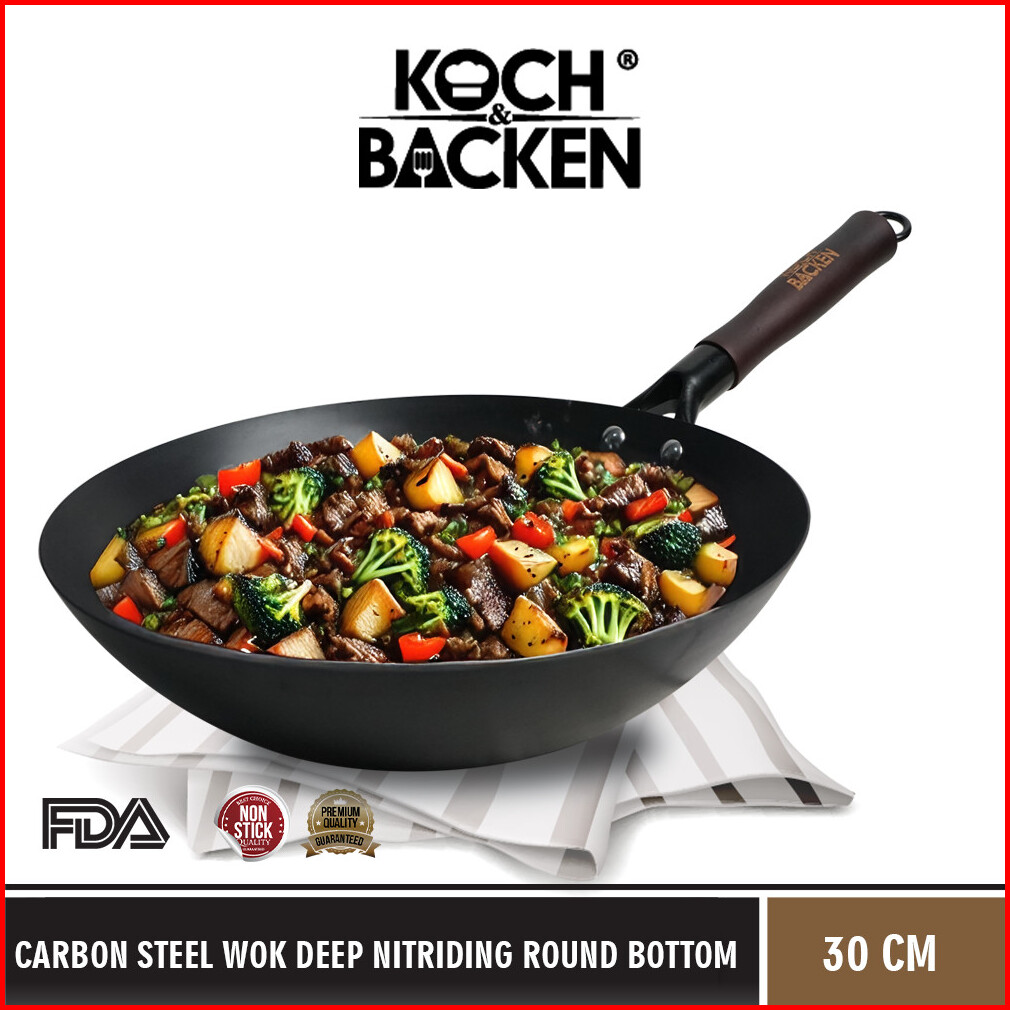 Koch Backen Carbon Steel Wok Deep Nitriding Round Bottom 30cm With Wooden Handle