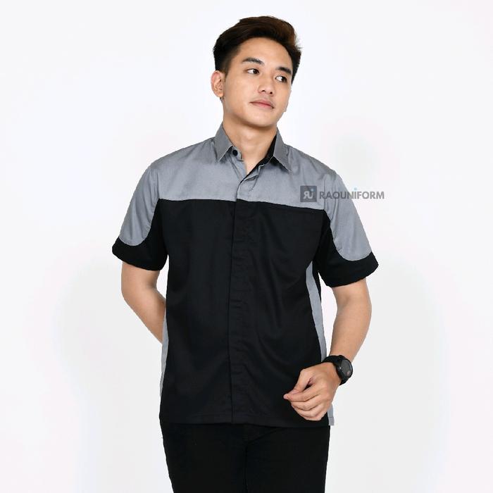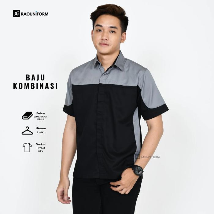Raouniform Kemeja Kerja Pria Baju Atasan Kombinasi American Drill Lengan Pendek Seragam Kantoran - Abu hitam S